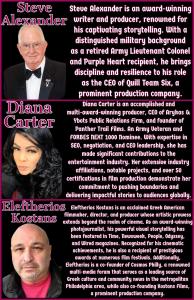 Leading the production team is the esteemed Army veteran and CEO of the renowned Hollywood Public Relations Firm, Arykas and Ybots, Diana Ramos-Santiago Carter. Diana's extensive background in the entertainment industry, coupled with her entrepreneurial spirit, make her an invaluable addition to the project. Additionally, she is the founder of Panther Trail Films Productions, known for producing exceptional content that captivates audiences.