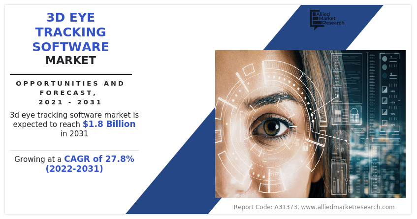 OREGAON, PORTLAND, UNITED STATES, July 19, 2023/EINPresswire.com/ -- As per the report published by Allied Market Research Titled “3D Eye Tracking Software Market by Type (Mobile Systems, Remote Eye Tracking, Tower-Mounted Eye Tracking), by Application (Scientific Research, Marketing and User Research, Industry and Human Performance), by End-use Industry (Retail, Robotics, Automotive, Consumer Devices, Assistive Technology Solutions, Others): Global Opportunity Analysis and Industry Forecast, 2021-2031”