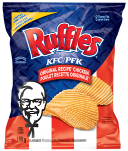 Ne manquez pas votre chance ! Procurez-vous dès aujourd'hui un sac de croustilles Ruffles à saveur de poulet recette originale PFK partout où les produits Ruffles sont vendus et dans certains restaurants PFK au Canada.