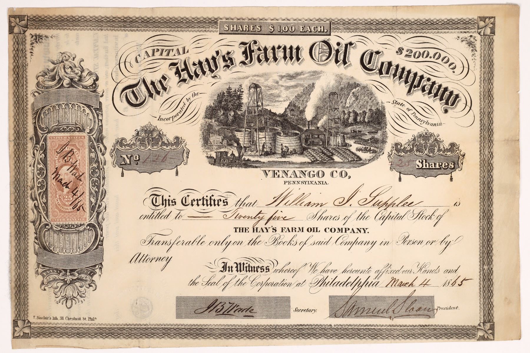 Hay’s Farm Oil Company (Venango Cty., Pa.) stock certificate no. 126 from 1865, featuring a vignette of oil derricks, tanks and barrels, signed by the president and secretary (est. $200-$500).