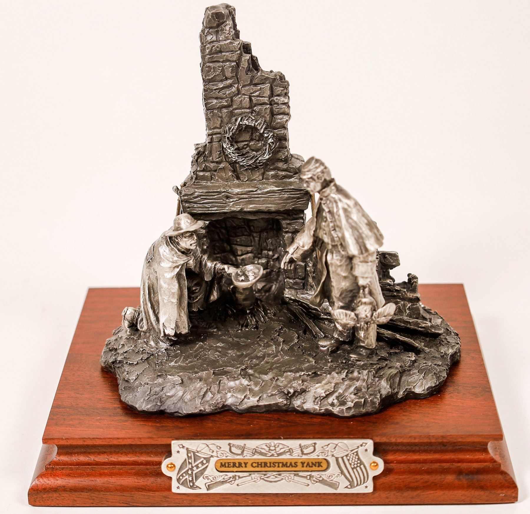 Pewter Chilmark Civil War sculpture by Francis J. Barnum, titled Merry Christmas Yank, 78 inches tall, depicting two soldiers in front of a fireplace at holiday time (est. $220-$600).