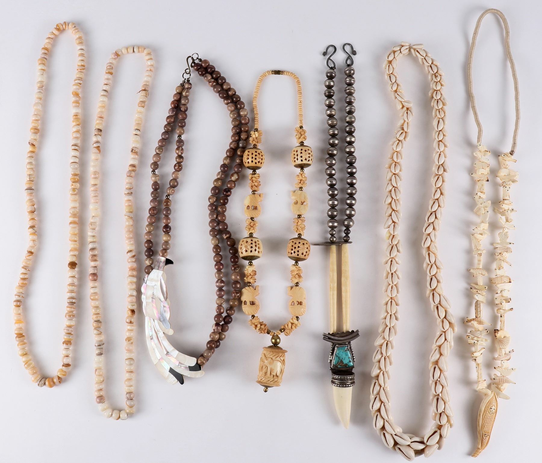 Lot 1439 is a group of seven custom, hand-made carved bone bead necklaces and shell necklaces (est. $600-$1,200). All beads are natural materials, with some unique hand-carved bone beads. Included are pieces that may be of Native American, Inuit, African and Tibetan origin. All are in fine condition and well made. One has a bright blue natural turquoise set in silver at the center.