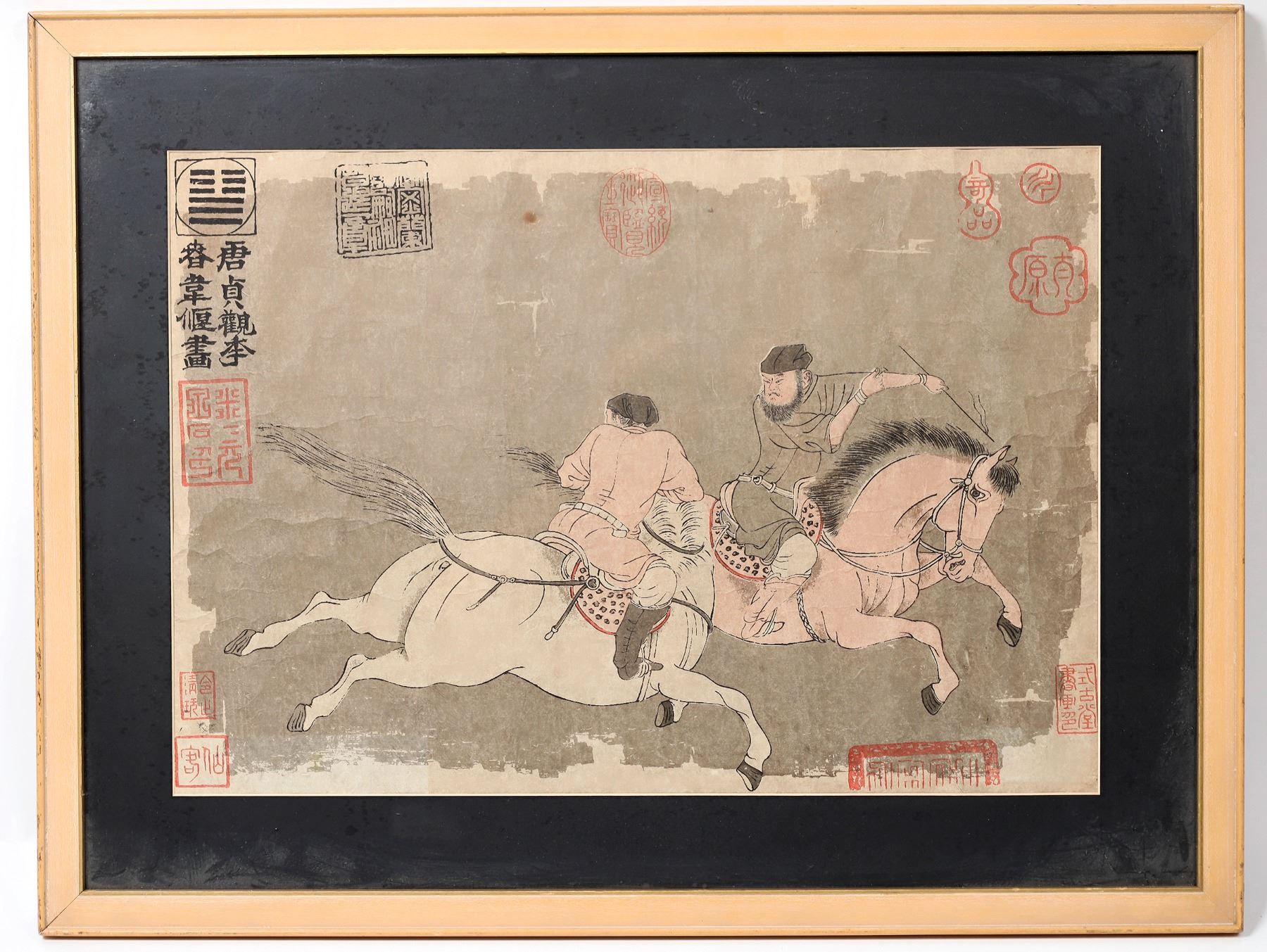 A sculpture of a lady looking upward and holding her arms outward, 14 inches tall, appearing to be cast bronze with a clay-like surface coating, signed on the bottom “Eason” and numbered (13/100), has an estimate of $200-$500. Also, an original framed Chinese fan style artwork depiction of a village scene with two men on horses, plus red and black stamps, contained in a frame that measures 19 ½ inches by 25 ½ inches, is expected to change hands for $1,200-$1,500.