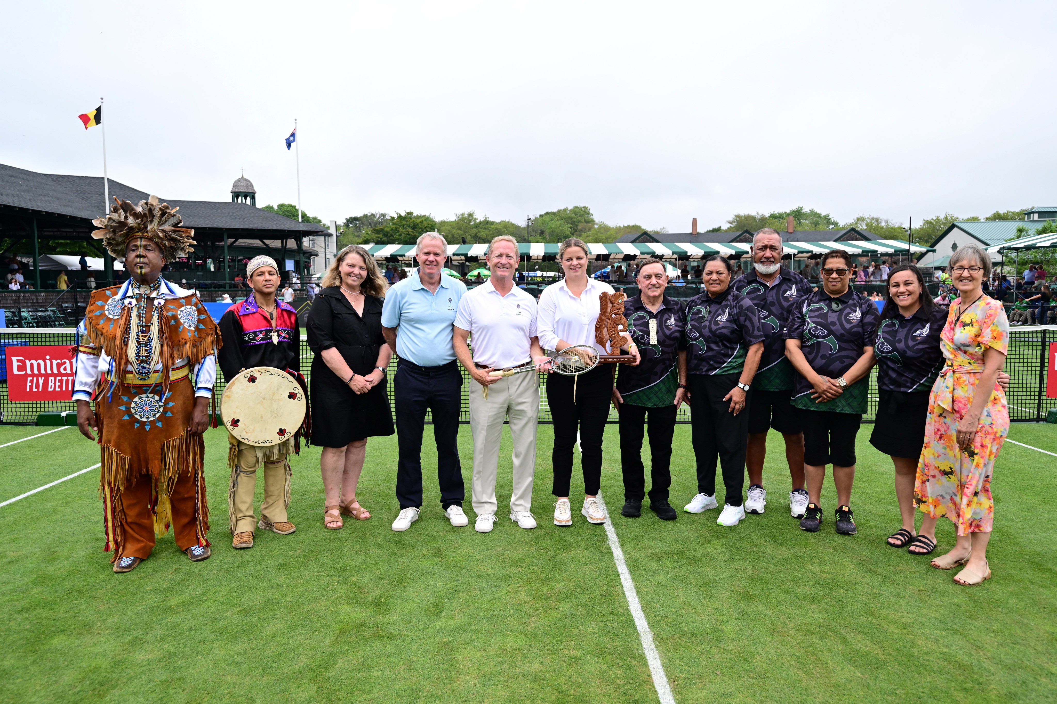 Tennis New Zealand President Terri-Ann Scorer and Aotearoa Māori Tennis Association President Richard Garratt presented the Toanga Whakairo to the ITHF on Centre Court. Scorer and Garratt were joined by master carver Maaka Te Moana, Narragansett First Nations Tribe Chief Sachem Anthony Dean Stanton, Tribal representative Thawn Harris, and Newport City Councilwoman Lynn Cegile.