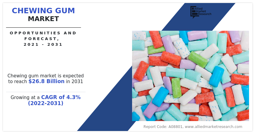 PORTLAND, OR, UNITED STATES, July 24, 2023/EINPresswire.com/ -- According to a new report published by Allied Market Research, titled, “Chewing gum Market," The chewing gum market size was valued at $16.1 billion in 2021, and is estimated to reach $26.8 billion by 2031, growing at a CAGR of 4.3% from 2022 to 2031.