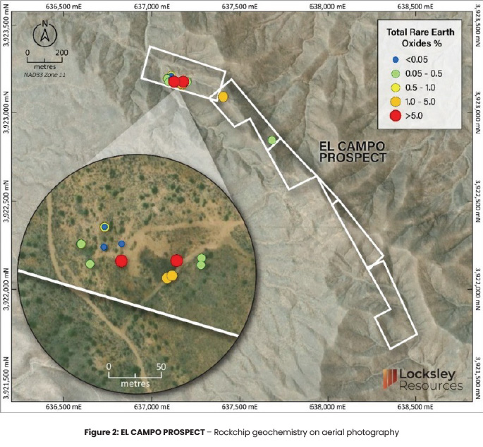 Locksley is partnering with MINEX Corp, an expert US based team assisting in advancing the next stage of field exploration activities. The team will lead with boots on the ground for the commencement of field work, with the intention of conducting field mapping of identified outcropping REE mineralisation on the El Campo Prospect and reconnaissance across the Mojave Project North and South blocks. The El Campo Prospect has an identified mineralised breccia with surface rock chip samples assaying up to 9.49%1 TREO and in close proximity to the Mountain Pass Mine.