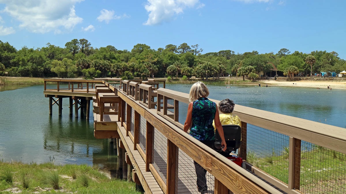 • An accessible fishing pier is available at Oscar Scherer State Park near Sarasota that features areas of lowered rails so that seated visitors have unobstructed views and may cast fishing lines.
