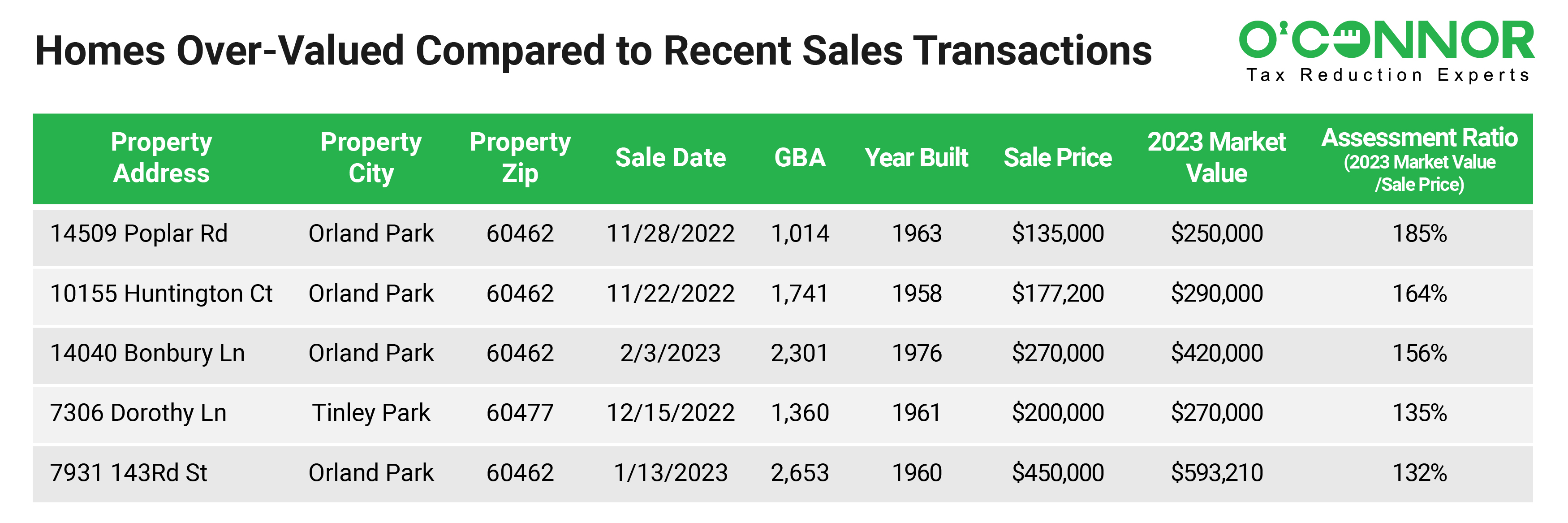 The homes in the first table are overvalued by 32-85% in comparison to sales transactions that occurred within 3 months of the valuation date (January 1, 2023). Unless these homeowners appeal their tax assessment, their property taxes will exceed a reasonable level of taxation.