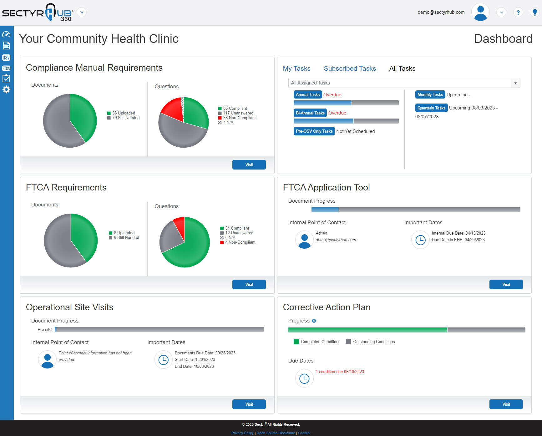 SectyrHub provides a health center team with a complete management solution including documentation, tasking, workflow, and visualization tools for executive management. The software informs users around the clock about the state of their compliance with U.S. Health Resources and Services Administration requirements for Section 330. The software also prompts staff to tackle deficiencies, especially before an operational site visit. With step-by-step guidance from SectyrHub, users can confidently ready themselves for HRSA reviewers and deliver on all the promises of the Health Center Program.