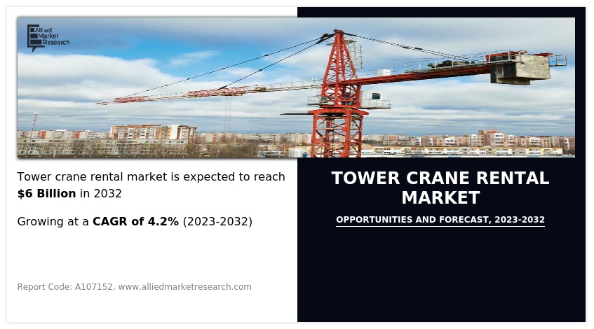 PORTLAND, UNITED STATES, July 31, 2023/EINPresswire.com/ -- According to a new report published by Allied Market Research, titled, “Tower Crane Rental Market," The tower crane rental market was valued at $3.8 billion in 2020, and is estimated to reach $6 billion by 2032, growing at a CAGR of 4.2% from 2023 to 2032.