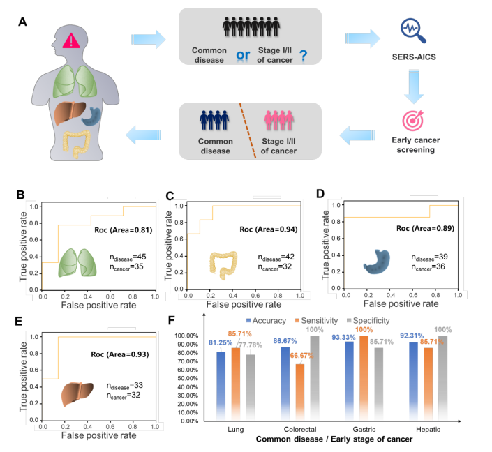 In a new paper published in eLight, a team of scientists, led by Professor Xiangheng Xiao from College of Physical Sciences, Wuhan University, have taken a significant leap foward by developing a lable-free SERS-Artificial intelligence method for cancer screening (SERS-AICS). This technology ingeniously merges the detection strengths of traditional SERS system with the analytical power of advanced big data tool. The team tested as little as 15ul of patient serum samples with Ag nanowires each for lung, colorectal, hepatic, gastric, and esophageal cancers, capturing the subtle changes in vibrational signals of molecules in cancer samples due to their altered physiology and pathology. The researchers then trianed and validated their predictive workflow to recognize cancer by analyzing molecular vibrational spetrum from two independent cohorts involving 382 healthy individuals and 1,582 cancer patients. The system demonstrated impressive efficay with an accuracy of 95.81%, a sensitivity of 95.40% and a specificity of 95.87% overall for five cancer types. Additionally, it was successful in distinguishing samples at an early stage of cancer from those with common diseases, while facilitating the creation of a data platform for more in-depth analysis.