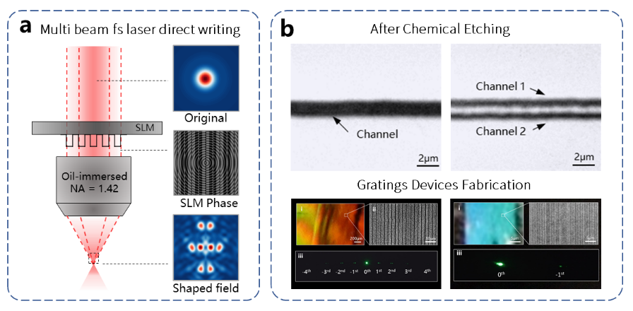 The one-to-one correspondence between spatial phase and the distribution of the light field provides feasibility for this method. In this article, researchers found that the binary phase period and laser flux jointly affect the size and gap of the processed structure, and realized the preparation of sub-wavelength scale photonic crystal structure units. Based on the above result, by adjusting the grayscale of the binary phase and the superposition method of the final phase, the multi-beam light field with controllable laser flux distribution and three-dimensional spatial structure can be customized, and the corresponding complex structure photonic crystal can be processed. Raman spectroscopy and X-ray photoelectron spectroscopy tests indicate that the structural units obtained by this processing method are the same as the results of single-beam point-by-point scanning under non-overlapping states, with high stability and reliability. Using this method, long-period and sub-wavelength grating structures were prepared, and experimental test results were consistent with theoretical calculations, further verifying the processing ability of this method.