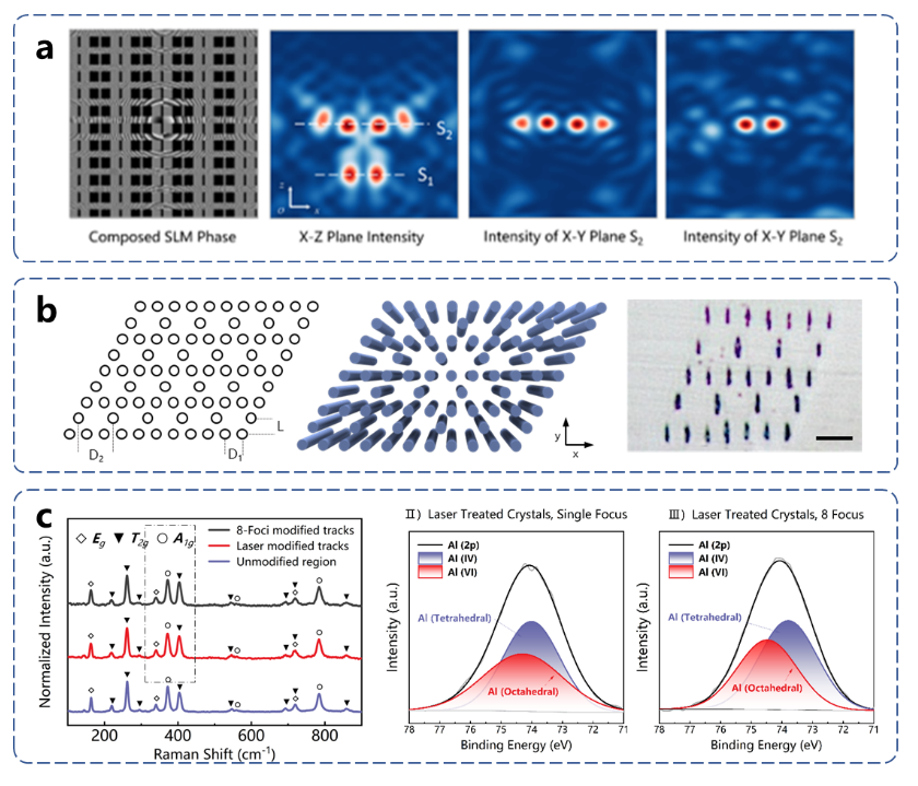Femtosecond laser can directly fabricate three-dimensional micro-nano structures inside transparent materials, which is one of the best ways to construct photonic crystal structures in crystal materials. However, the existing femtosecond laser processing technology for photonic crystals usually adopts a single-beam point-by-point scanning strategy, which is limited in the preparation of nanoscale unit structures due to the overlapping of processing trajectories and motion control accuracy. Micro-lens array processing technology and laser interference processing technology provide solutions to the above problems to a certain extent. However, the former is not flexible enough, and different micro-lens arrays need to be designed and fabricated for different target structures. Although the latter has high flexibility, it can usually only be used to process flat two-dimensional structures, lacking three-dimensional customization ability. Therefore, new femtosecond laser processing technology is urgently needed for the preparation of nano-scale three-dimensional spatial photonic crystal structures inside crystals.