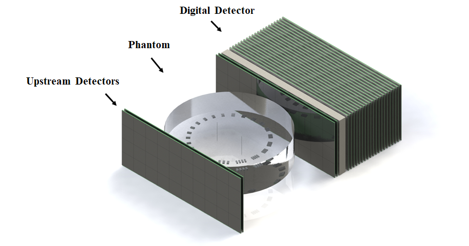 The Hi’CT system features a fully digital architecture with a compact length of approximately 10 cm, facilitating seamless integration into space-constrained heavy ion therapy devices. The core of Hi’CT is the digital segmented multi-layer detector, comprising upstream and downstream detectors, a compensator block, and sampling layers. This design accurately measures the endpoint of particle range near the Bragg peak with excellent detection efficiency. Its compact design allows for broader adaptability and easy integration, significant improving treatment qualities.