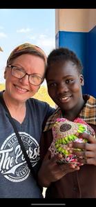 Sew Powerful Purse Maker Jan Paul shares a special moment with a student in Livingstone, Zambia.