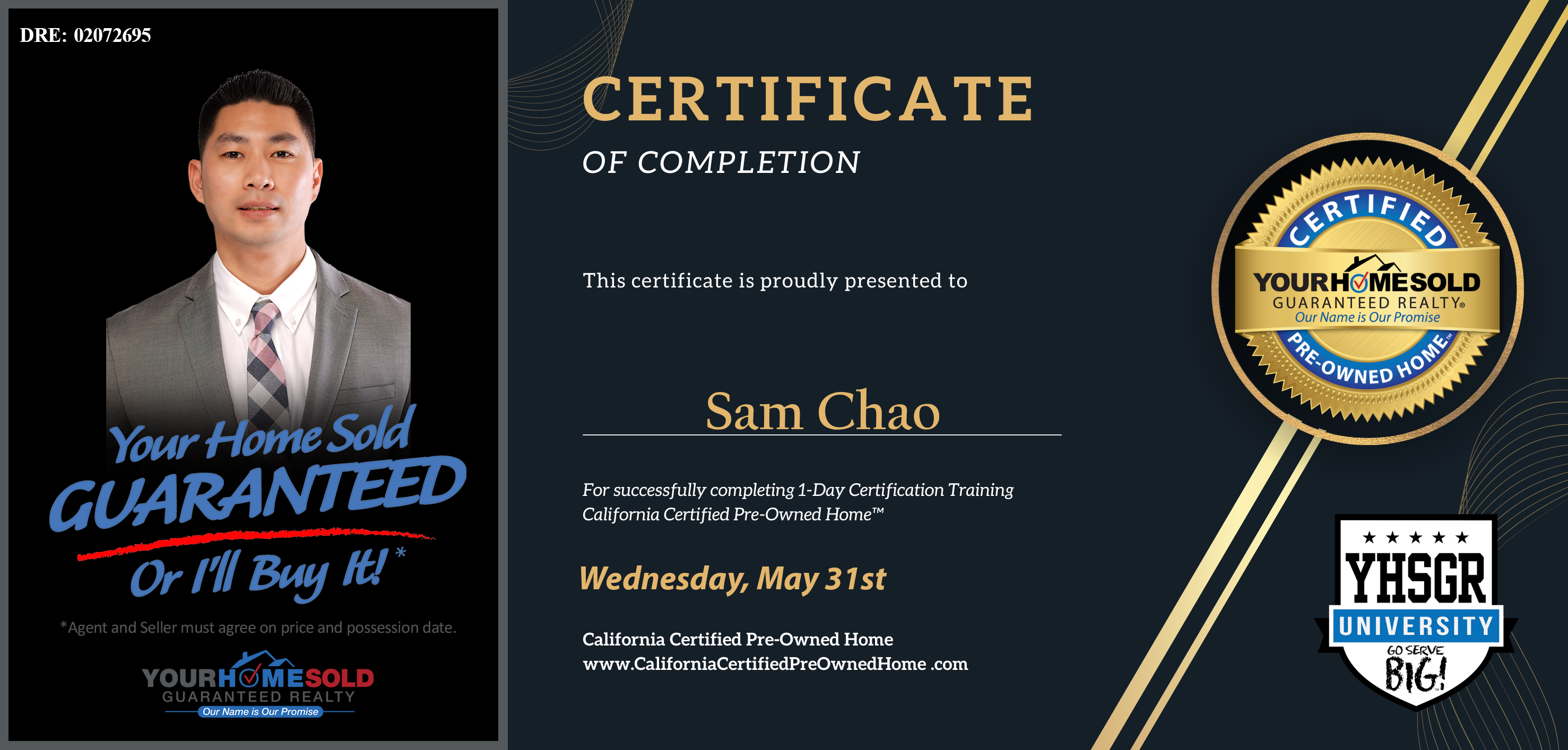 Certified Pre-Owned Home™ Agent Certification Completed by Sam Chao at Your Home Sold Guaranteed Realty
