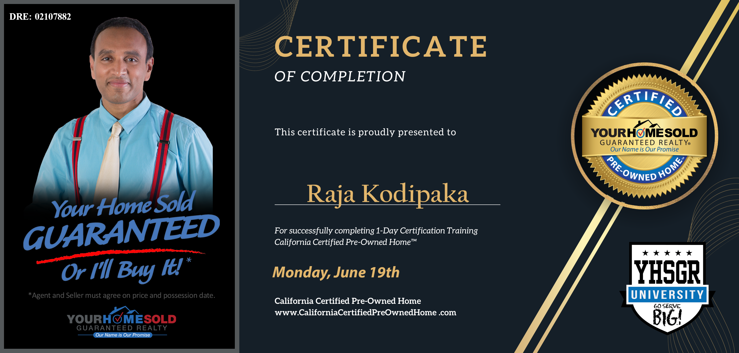 Raja Kodipaka's completion of the Certified Pre-Owned Home™ (CPO) agent certification solidifies Your Home Sold Guaranteed Realty's commitment to delivering exceptional service and maximizing the value of every real estate transaction. With Raja's expertise and the exclusive benefits of the CPO program, clients can expect an unparalleled experience that simplifies the buying and selling process.