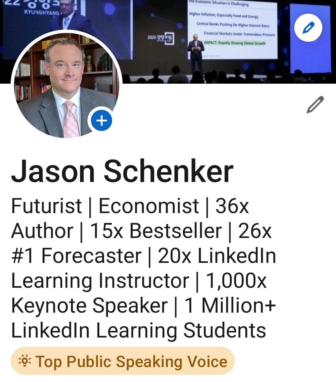 Linkedin has named renowned speaker, economist, and futurist Jason Schenker Top Voice for Public Speaking.