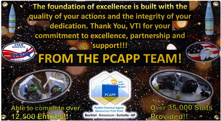 This milestone coincides with the successful completion of a significant project. Workers at the Pueblo Chemical Agent-Destruction Pilot Plant recently destroyed the final munition in the stockpile of obsolete chemical weapons stored at the U.S. Army Pueblo Chemical Depot. On June 22, 2023, workers at the plant safely destroyed the final round of the stockpile. The U.S. Army recognized Vinyl Technology for their contribution of over 35,000 DPE suits to this project alone.