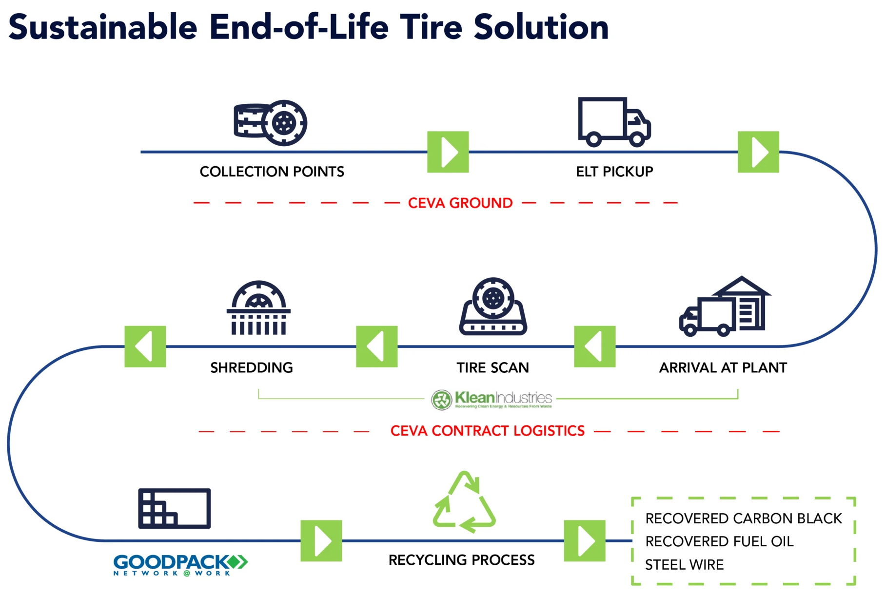 CEVA is partnering together with Klean Industries, a leading company providing technologies and solutions to solve the global ELT issue, and Goodpack, a world leader in reusable metal containers, to develop a full-circle supply chain solution for ELT. This partnership will leverage the expertise and resources of each company to create measurable change in the end-of-life tire problem. The proposed solution combines green logistics, sustainable processes, and digital technology infrastructure that will work together for a low-carbon, circular economy with an overall goal of zero waste to landfill.
