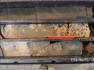 Figure 5: Hole ORD005 – Gold bearing massive sulphide breccia with clasts of shale
