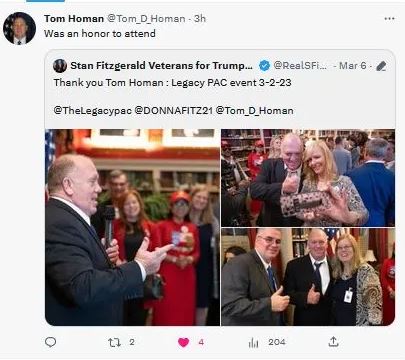 Tom Homan, former Acting Director of U.S. Immigration and Customs Enforcement, is an advisory board member of VFAF https://veteransforamericafirst.org/meet-the-team/ and has been with the organization for years. VFAF ethos include a primary objective of securing our border. There is no bigger pundit for president Trump and securing our borders than Tom Homan. Homan also came and spoke at the Legacy PAC kick off event earlier this year at the request of Stan Fitzgerald. Legacy PAC is partnered with VFAF and supports a secure border .