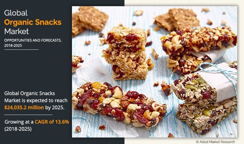 PORTLAND, OR, US, August 11, 2023/EINPresswire.com/ -- The global Organic Snacks Market was valued at $8,783.2 million in 2017, and is expected to garner $24,035.2 million by 2025, registering a CAGR of 13.6% from 2018 to 2025. Snacks are small servings of food eaten between main meals. Organic snacks are food prepared using ingredients that comply with the standards of organic farming. Organic food is also Genetically Modified Organism (GMO)-free and are free of artificial additives and can be better digested by the human body. It includes snacks such as potato chips, corn chips, tortilla chips, and bakery products such as bagel, biscuits, doughnuts, cheese snacks, nut bars, pretzels, crackers, pita chips, and confectionery such as chocolates, candies, candy bars, and other snacks. As consumers tastes have expanded in an increasingly globalized world, many consumers are experimenting with organic foods to satiate their desire for unique taste experience and to align with their increased focus on healthy lifestyles.