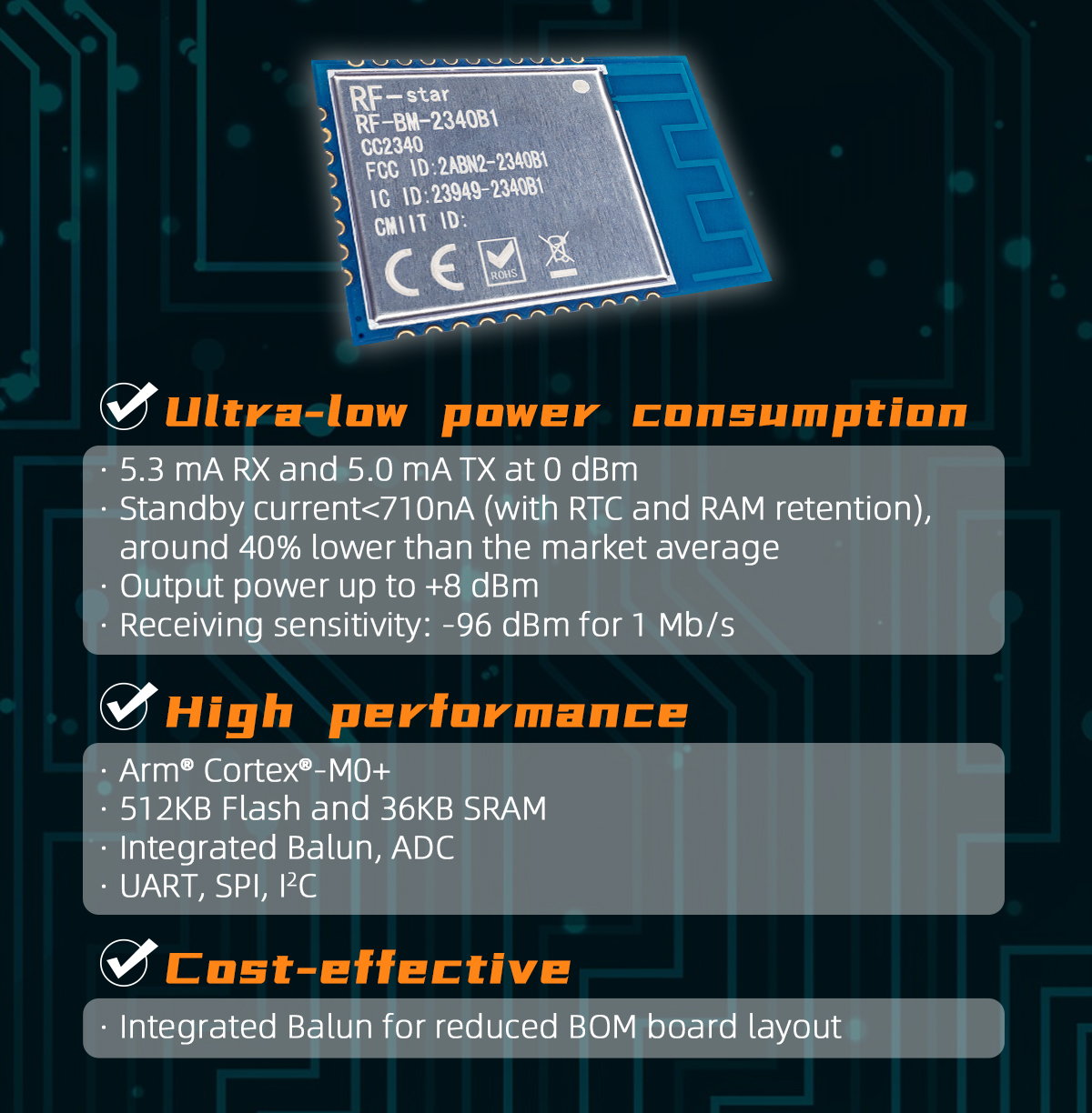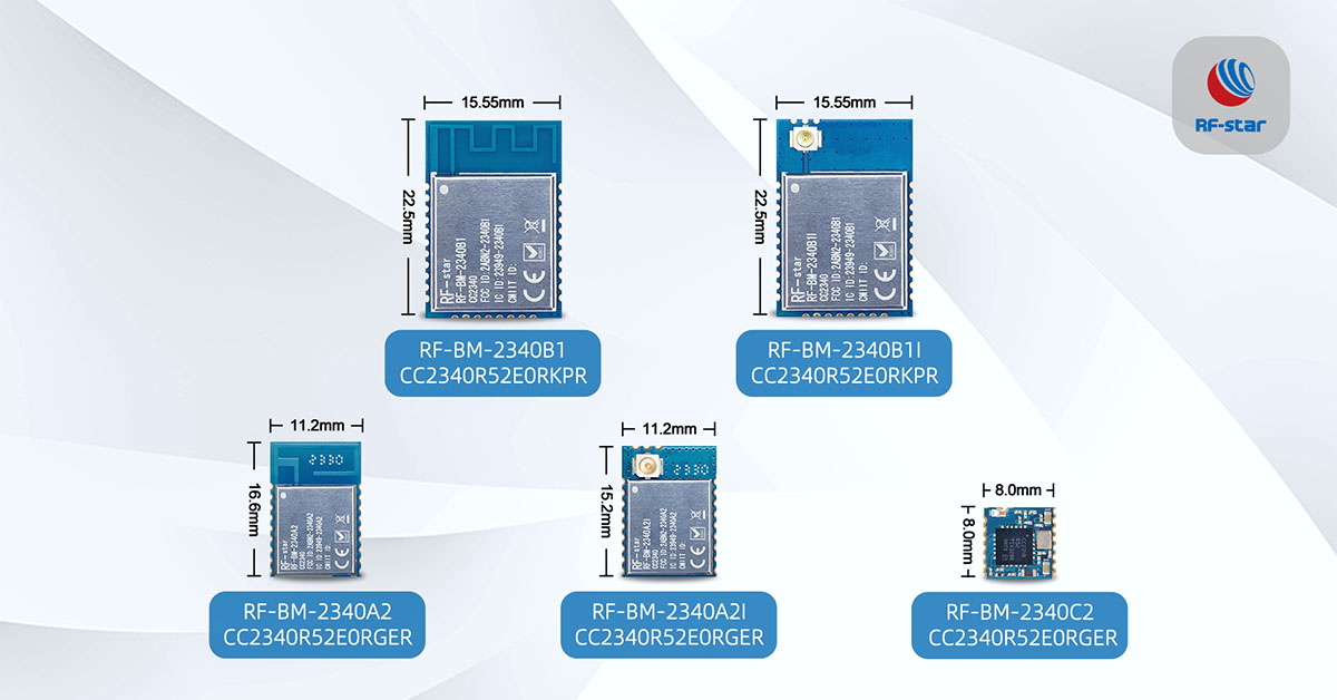 SASKATOON, SASKATCHEWAN, CANADA, August 16, 2023/EINPresswire.com/ -- RF-star today rolled out its BLE module portfolio based on TI’s new CC2340 MCUs, offering high-quality and cost-effective Bluetooth Low Energy (BLE) modules. These modules have superior standby current and RF performance, making them suitable for ultra-low-power wireless applications like smart homes, medical devices, industrial sensors, and automotive applications. With a lower price, engineers can now easily integrate Bluetooth LE modules into their products.Last year, Texas Instruments(TI) announced its fourth-generation BLE Wireless MCUs: CC2340 family. The CC2340 device family includes CC2340R5 and CC2340R2 versions, providing a highly integrated wireless connectivity function with support for Bluetooth 5.3 Low Energy, ZigBee, and proprietary 2.4GHz protocols.