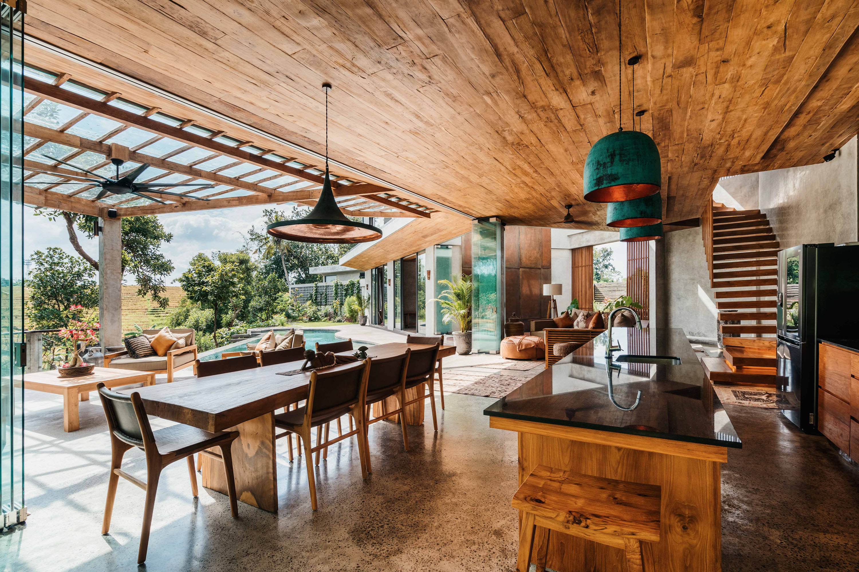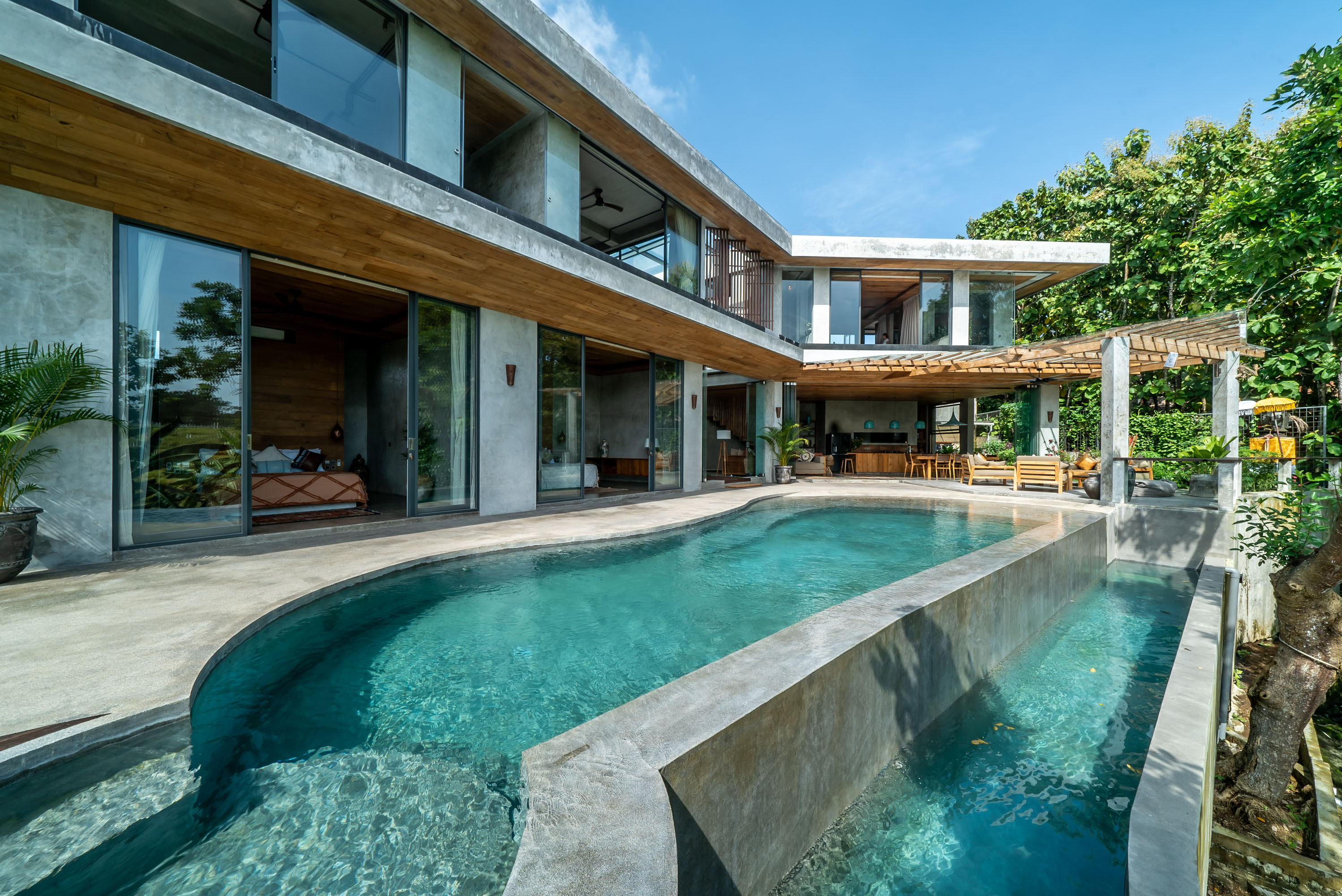 In the secluded area of Pererenan, Canggu, Bali, Villa Krtajna offers a blend of contemporary interiors and biophilic design. Spanning a build area of 1,400 square meters on a land plot of over 1,022 square meters, Villa Krtajna consists of a primary residence and a separate half bedroom loft. Villa Krtajna contains six bedrooms and nine full bathrooms. Krtajna’s design embodies a fusion of nature and sustainable living, designed to enhance well-being and create a healthier environment.