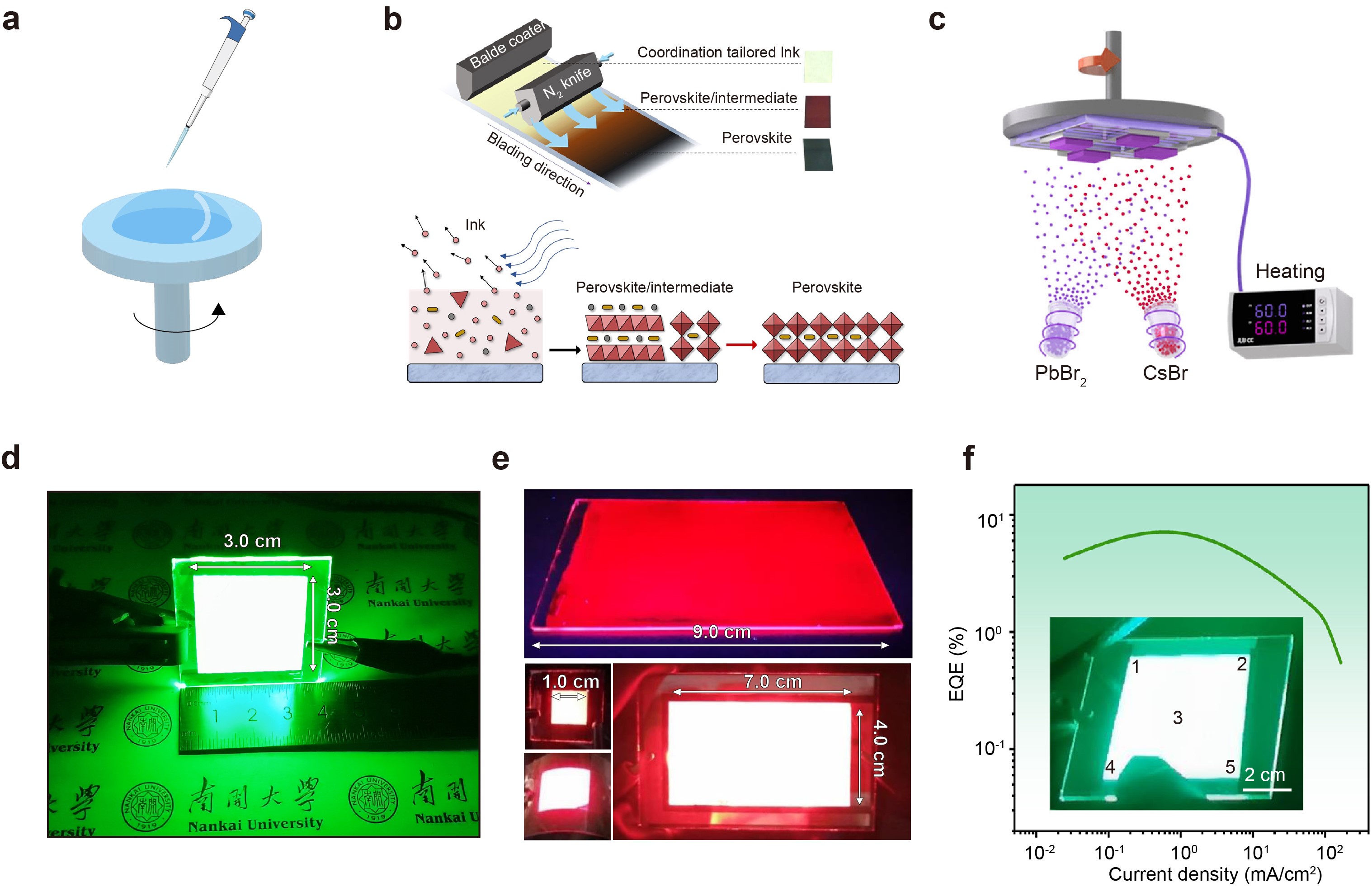 Large-area PeLED: The large-scale fabrication of PeLEDs is of significant importance towards display panels. High-performance PeLED devices demonstrated in lab-scale production usually have only a few square millimetres of emission area. When enlarging the emission region, the perovskite film shows decreased crystallinity and uniformity, resulting in low device performance. These drawbacks make PeLEDs challenging to transfer their excellent electroluminescence (EL) features into scalable manufacturing lines. To achieve large-area and high-throughput production of the devices, developing feasible large-area perovskite film depositing technology is of necessity. It includes improving the existing spin-coating method and using large-scale compatible depositing technologies such as new-type blade-coating or vapor deposition methods.