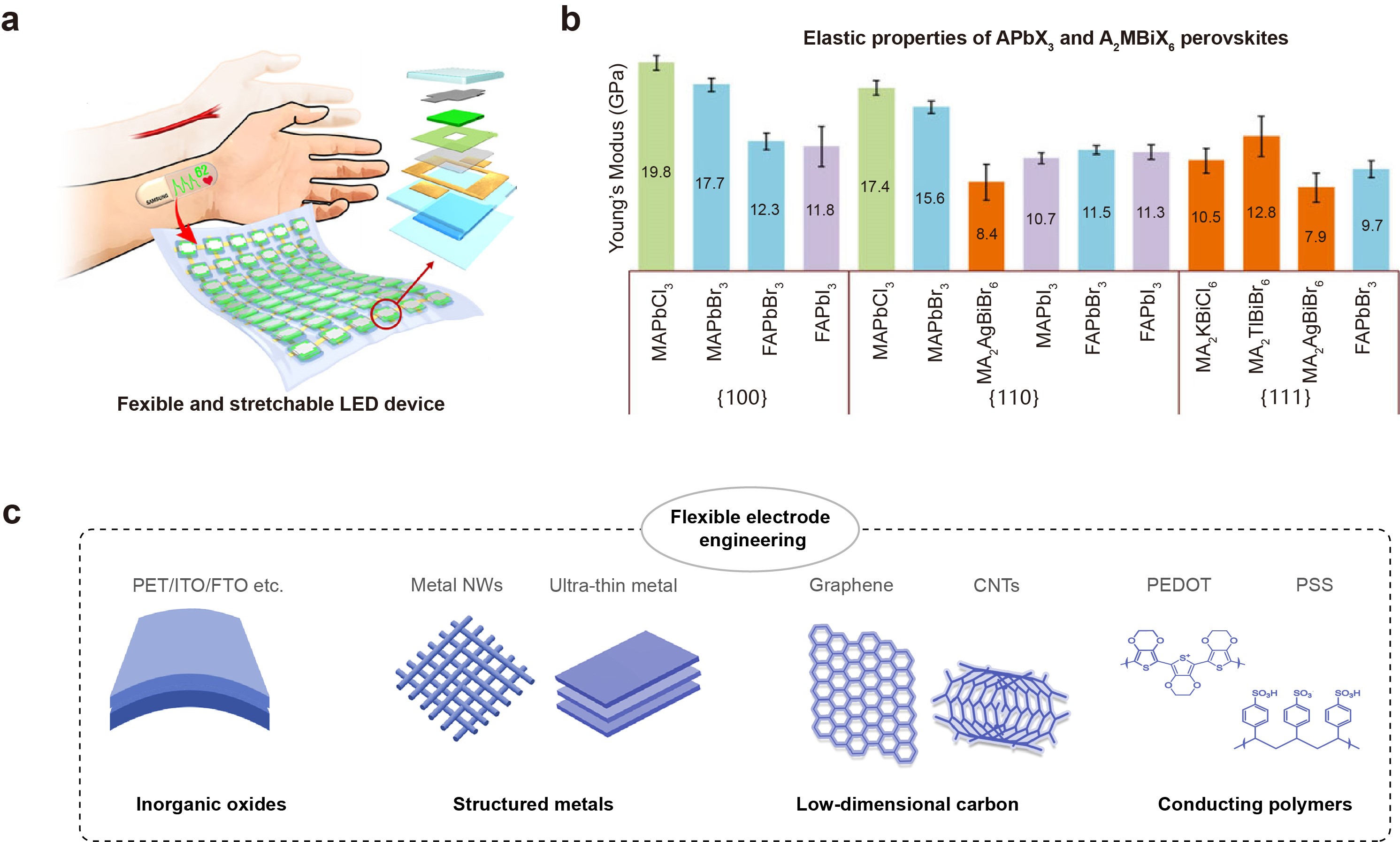 Flexible PeLEDs: Flexible LEDs have become revolutionary devices for their various potential applications, such as portable wearable displays and biomedical imaging. In this section, the authors briefly introduce the progress of Flexible PeLEDs. They describe mechanical property regulation strategies for perovskite emitting layers in flexible and stretchable devices. The relationship between structural optimization and material optoelectronic properties is also explained. They review electrode materials compatible with FPeLEDs, such as structured metals, conductive polymers, low-dimensional carbon materials and their composites. Comprehensive improvement strategies for these candidate materials' parameters, such as flexibility, conductivity, and transmittance, are also proposed. They also discuss the interfacial and energy level engineering toward improving these electrodes' compatibility with the perovskite active layer.
