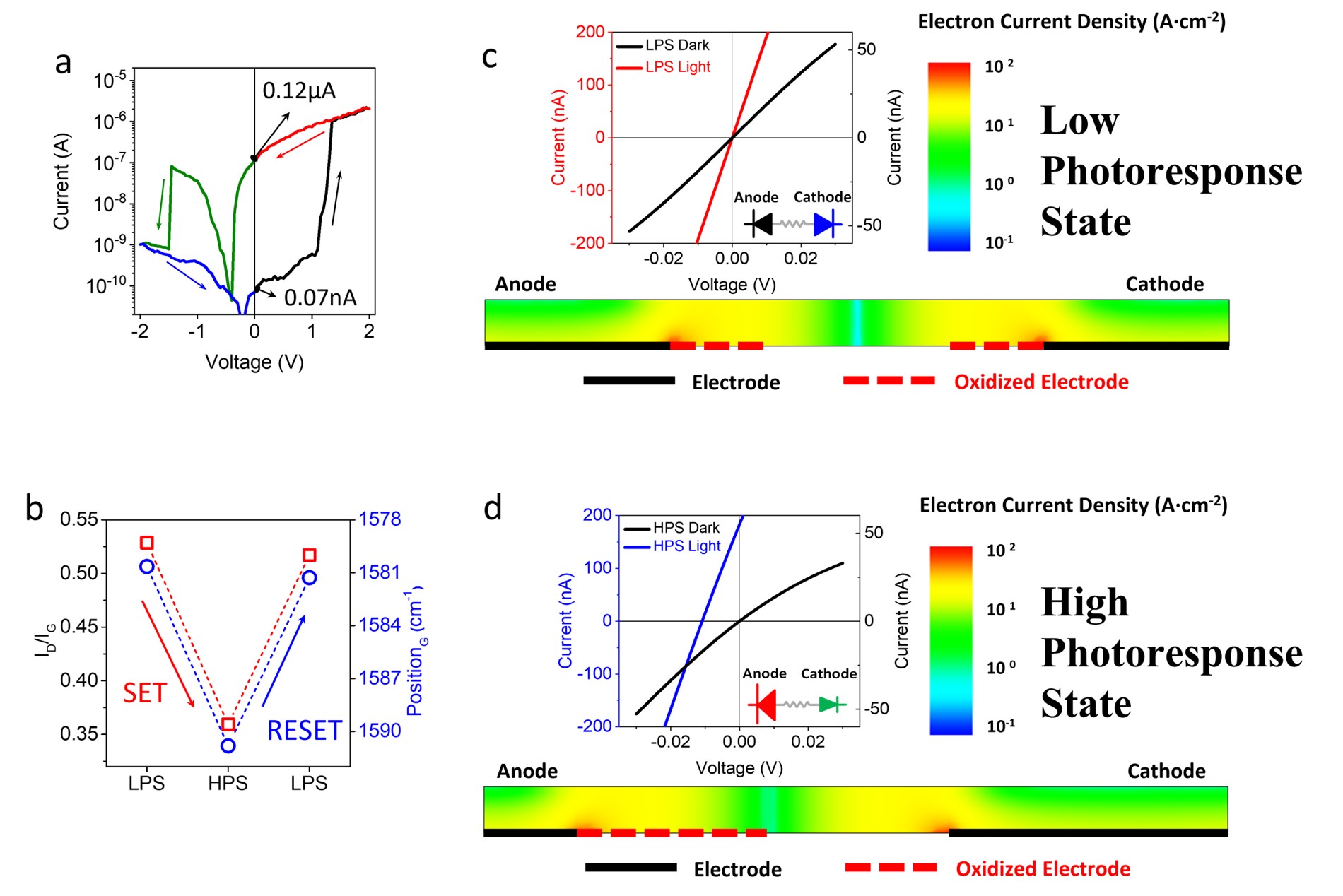 “We design a two-terminal device with MoS2-xOx and specific graphene for three purposes in one: (1) to provide low barrier energy for the migration of oxygen ions; (2) to perform as geometry-asymmetric metal–semiconductor–metal van der Waals heterostructures with multi-photoresponse states; and (3) as an extension of a memristor, this device not only provides tunable conductance, but also demonstrates reconfigurable photoresponse for reading at zero bias voltage.”