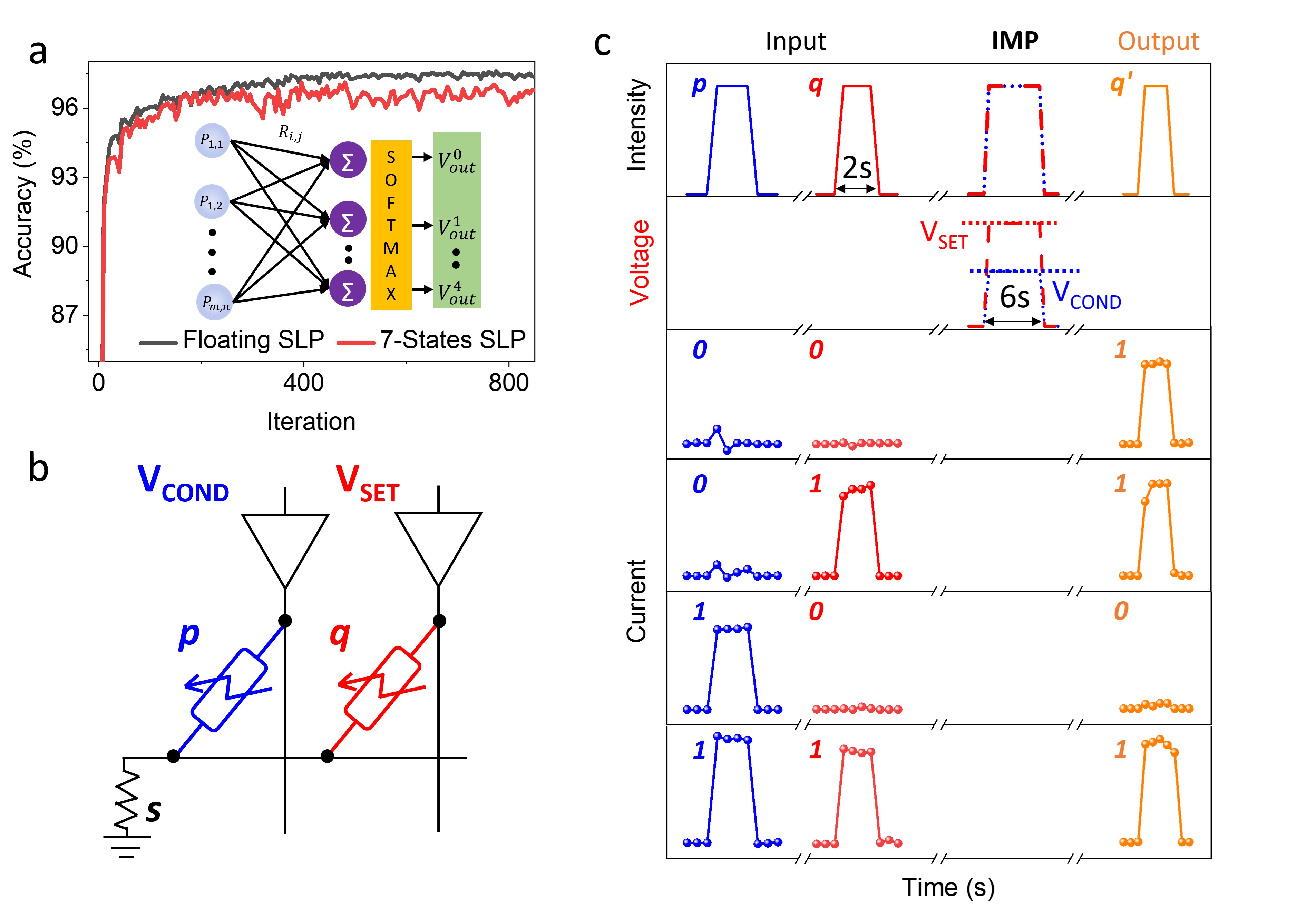 The photo-memristor demonstrates tunable short-circuit current in a non-volatile mode under illumination. By mimicking the biological functionalities of the human retina and designing specific device structures, the devices can act as neural network for neuromorphic visual processing and implementation of completely photoresponse-stateful logic operations triggered by electrical and light stimuli together. It can support various kinds of sensing tasks with all-in-one sensing-memory-computing approaches. These scientists summarize the operational principle and feature of their device: