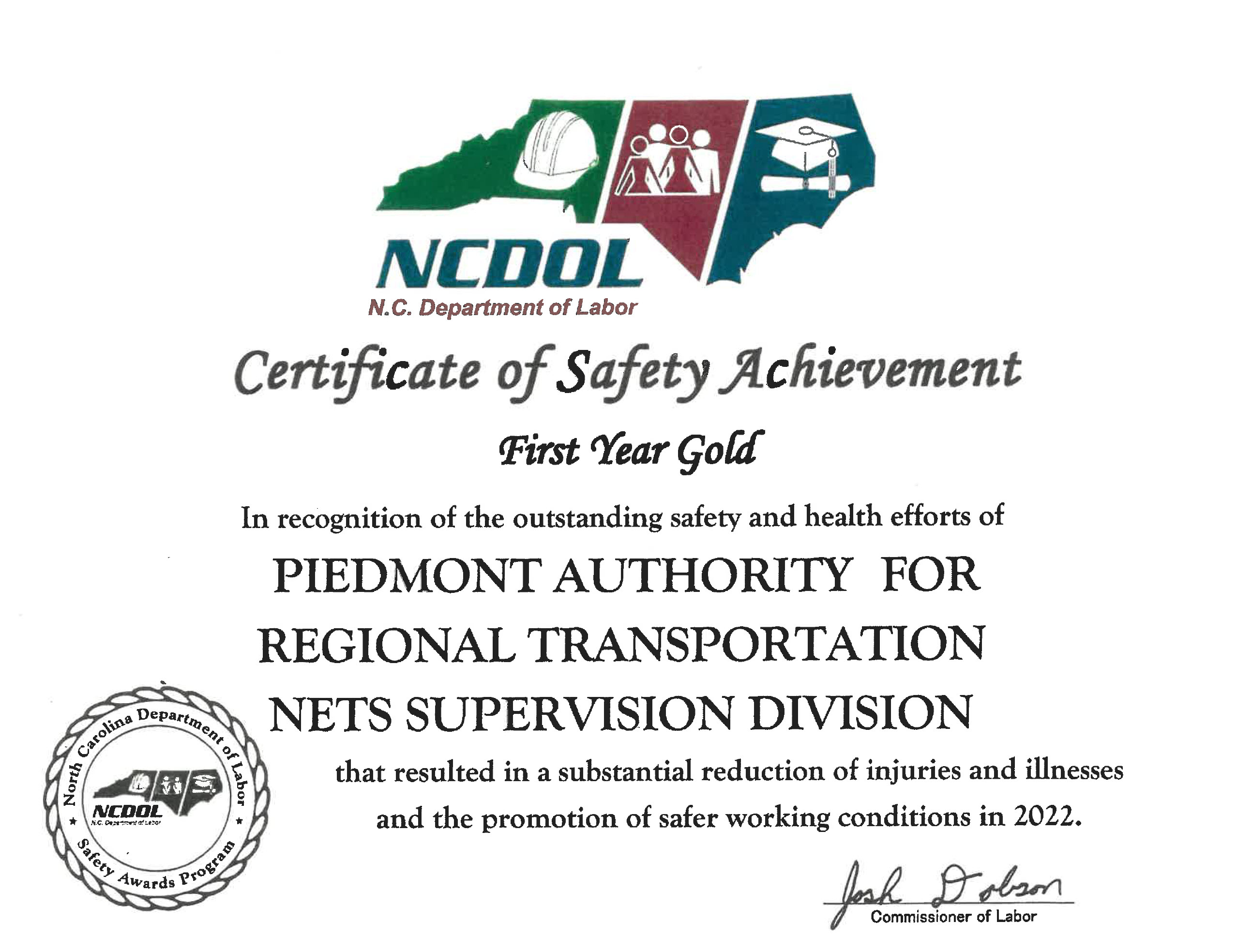 “We congratulate National Express Shuttle and Transit and our PART staff on winning a 2022 NCDOL Safety Award,” said Scott Rhine, CEO and General Manager, Piedmont Authority for Regional Transportation. “It reflects a dedication to maintaining a safe working environment and providing efficient, effective, and safe public transit service to citizens of the Piedmont Triad.”