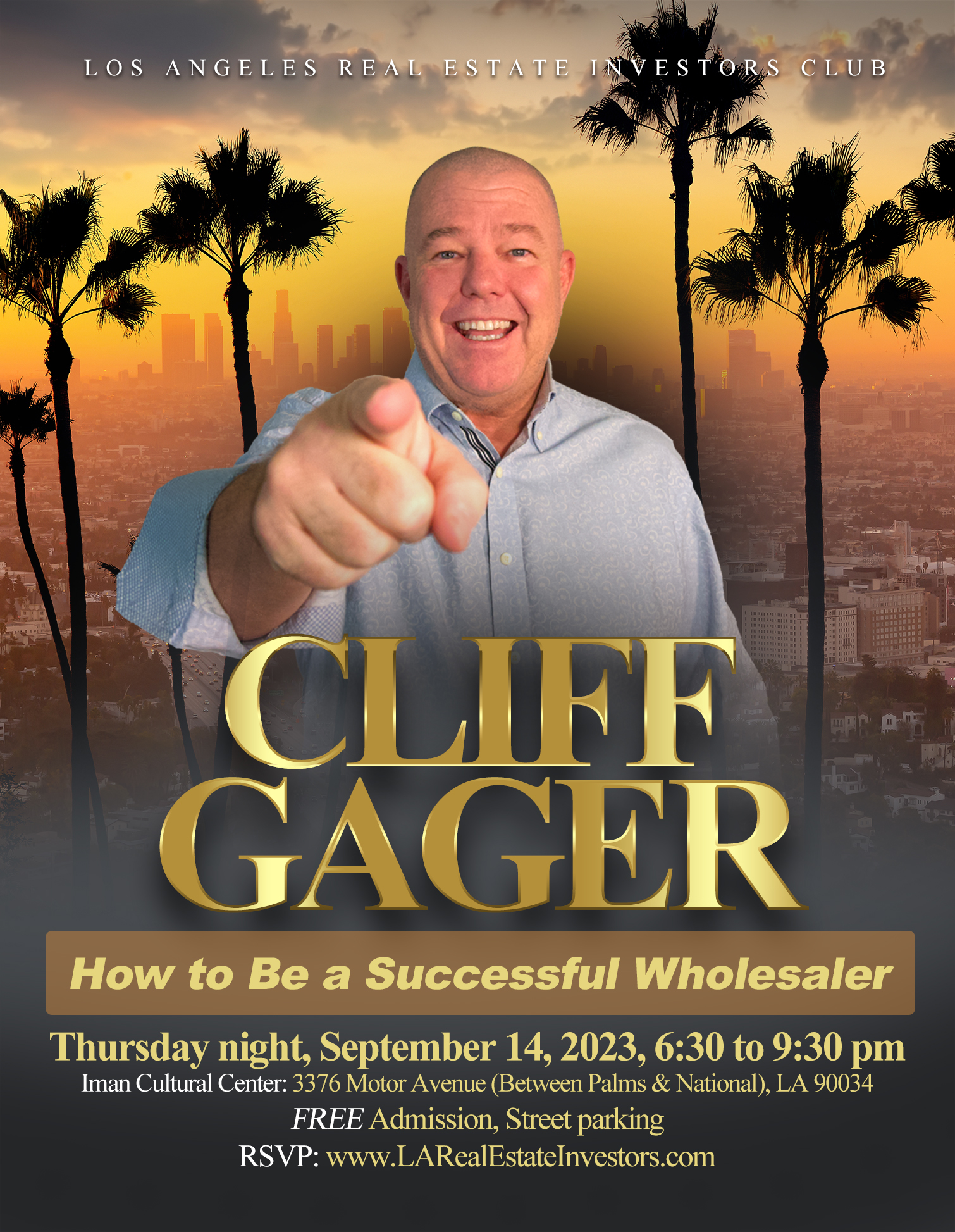 LOS ANGELES, CA, UNITED STATES, August 15, 2023/EINPresswire.com/ -- Wholesaling. When it comes to real estate investing, the easiest way to get started is wholesaling. Why? Because investors don’t need any money, don’t need any credit, and can earn profits within days (not months). Best of all, wholesalers do not actually taking title to the property, so avoid all the risks. With wholesaling, investors simply get a property under contract and then sell the contract (not the property) to another investor. If this sounds good, then attend LAC-REIA's September meeting because the #1 authority on wholesaling will be speaking.Special Guest Speaker. LAC-REIA's guest speaker will be Cliff Gager, the man who invented wholesaling. Well, not really, but he makes it easy to understand and implement. With Cliff, investors will learn how to find real estate "deals" and then how to wholesale them to other investors.