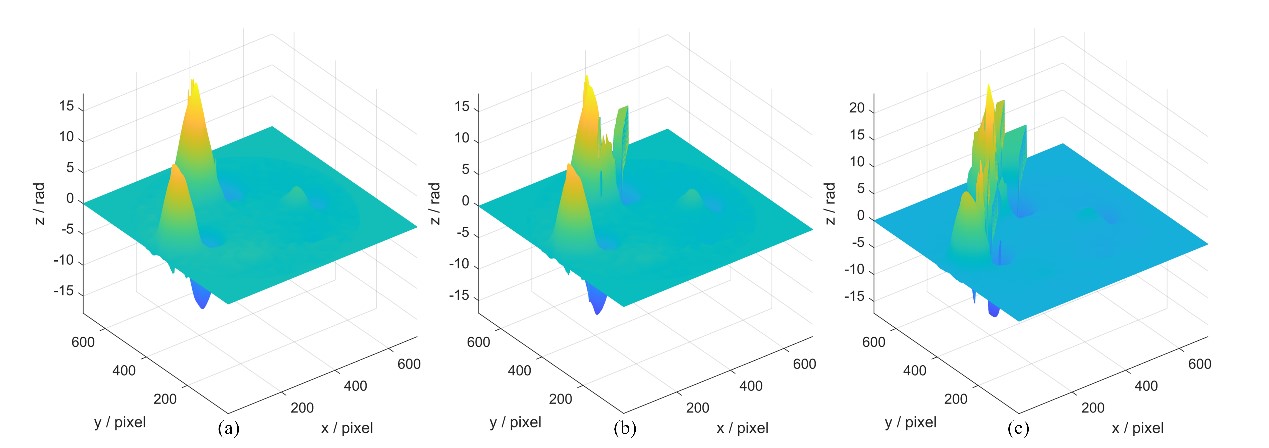 In order to verify the effectiveness of the proposed method for phase extraction in this study, we obtain the speckle patterns under different spectrum overlapping cases by simulation and experiment, and also compare two other commonly used phase extraction methods. The following figure shows the real phase of the phase map obtained by the three phase extraction methods after same filtering and unwrapping.