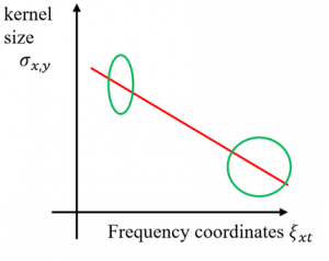 Since modern optical systems widely use circular aperture diaphragms, the proposed method uses the Hough transform to analyze the speckle pattern spectrum, obtains the coordinates of the center point of the object spectrum and the radius of the spectrum, and roughly determines the frequency band of the window Fourier ridge through the correspondence between the frequency domain coordinates and image pixel coordinates, which reduces the running time of the algorithm and allows the search the local frequency with smaller step size. In addition, for the regional characteristics of the object light spectrum when the spectrum is mixed, using a large window for WFR will lead to increased speckle size, and a small window will be mixed with zero-order information, so this paper proposes the use of a linearly transformed elliptical window for WFR, as shown in Figure 1, the elliptical window with the long axis parallel to the y-axis direction is used near the zero-frequency, and with the right shift of the frequency scan interval linearly changes to an elliptical window with the long axis parallel to the x-axis direction, thus maximizing the use of spectrum information and improving the quality of phase extraction.