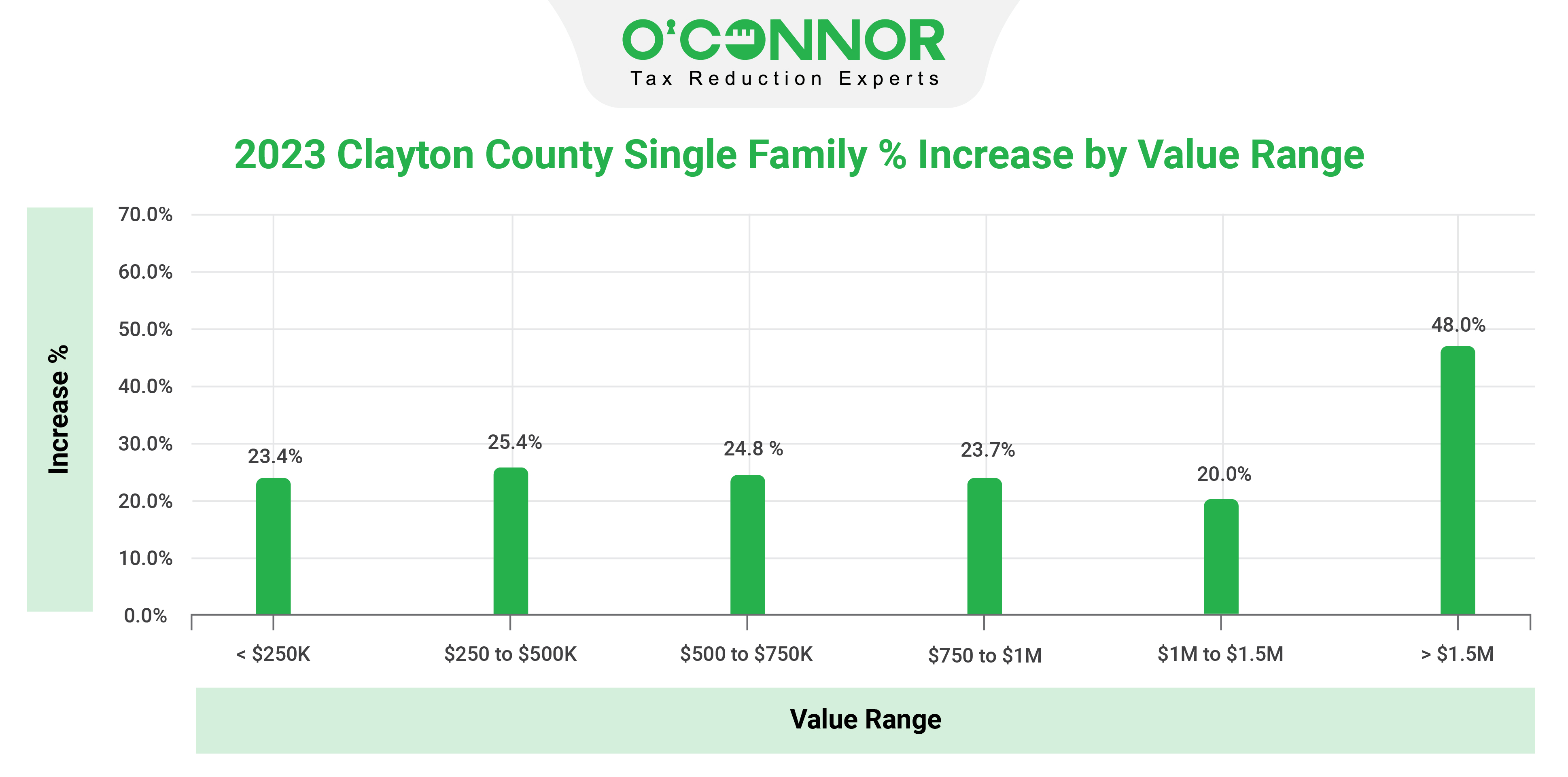 A median property in Clayton County has increased in value by 24.3%, but residences over the $1.5M price range have been impacted harder, seeing their homes growing in value by 48%. Homeowners in the $250K to $500k price bracket are also experiencing the burden as a result of 25.4% higher evaluations for 2023.