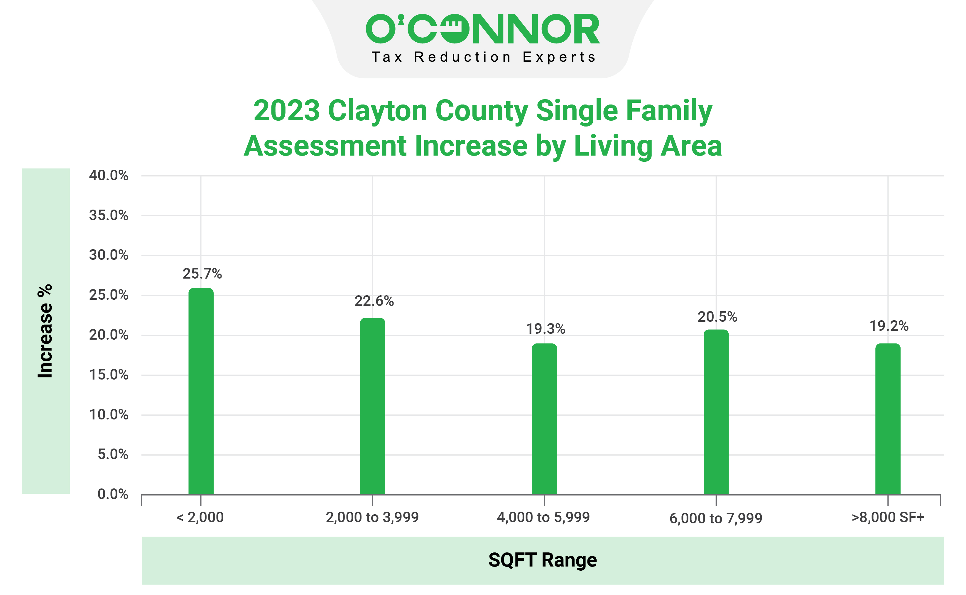 In Clayton County, single-family houses with fewer than 2,000 square feet have seen the most gain in value. Property tax assessments increased by 20.5% for homes between 6,000 and 7,999 square feet and by 22.6% for homes between 2,000 and 3,999 square feet.