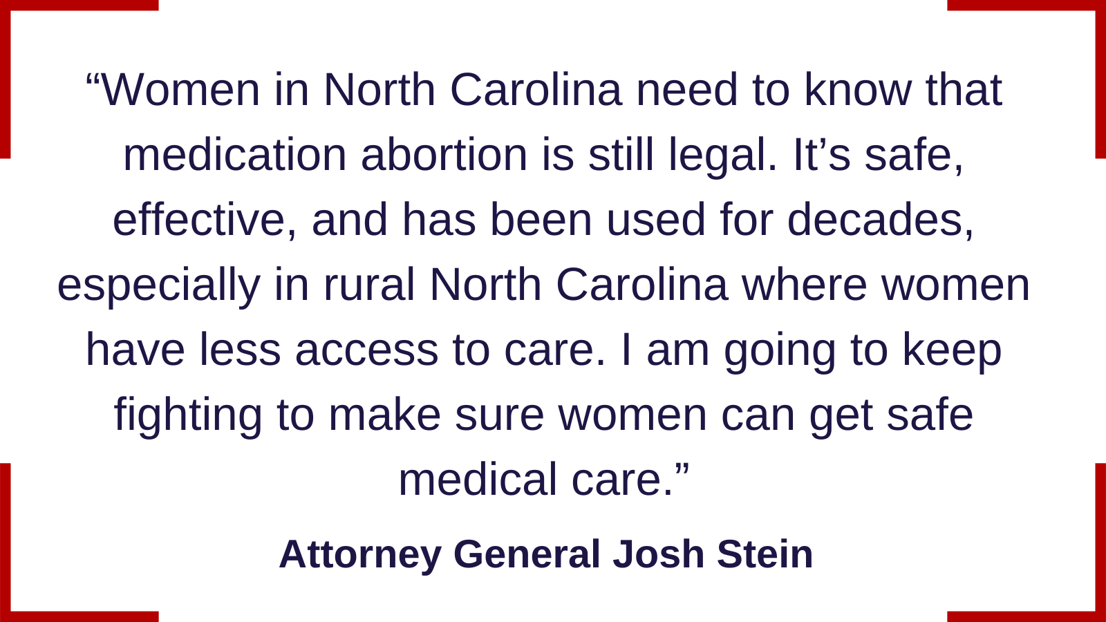 “Women in North Carolina need to know that medication abortion is still legal. It’s safe, effective, and has been used for decades, especially in rural North Carolina where women have less access to care. I am going to keep fighting to make sure women can get safe medical care.”