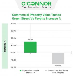 Comparing Fayette County commercial increase to the analysis of the Green Street real estate firm. Commercial property value trends, according to Green Street, are 15% lower for 2023, while there is a 15.8% Fayette County Tax Assessor assessment rise, creating a disparity of over 30 points between the two values.
