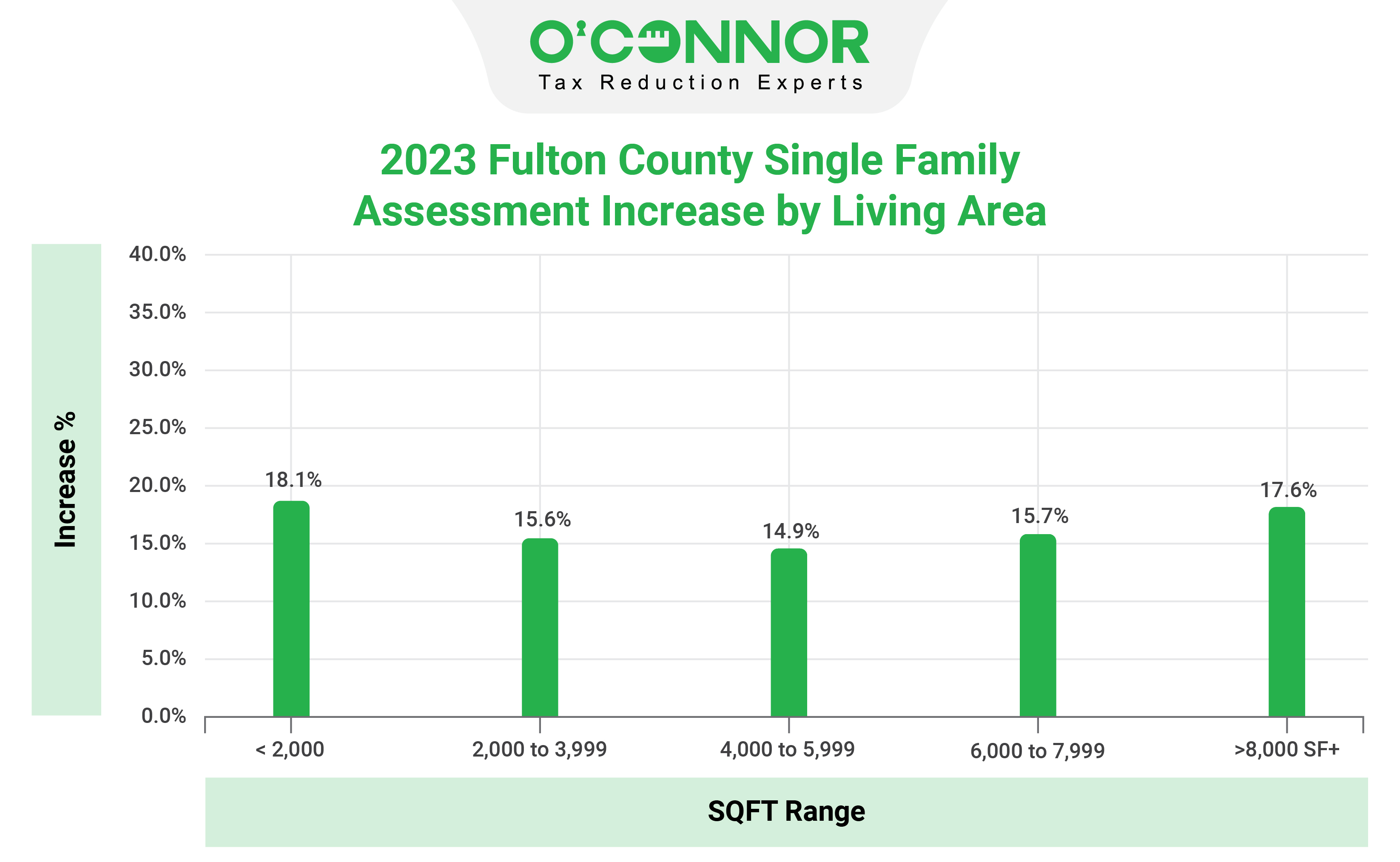 Fulton County single-family houses with fewer than 2,000 square feet have witnessed the most dramatic increases of over 18%. Property tax appraisals for homes more than 8,000 square feet increased by 17.6%, while those between 2,000 and 3,999 and 6,000 to 7,999 square feet increased by 15.7% and 15.6%, as well.