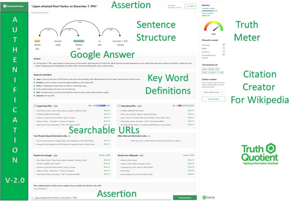UNION BRIDGE, MARYLAND, UNITED STATES, August 22, 2023/EINPresswire.com/ -- Truth Quotient LLC, a leading provider of advanced software and artificial intelligence (AI) solutions, announced today the launch of its latest product, an advanced software tool that can authenticate the validity of human language assertions.