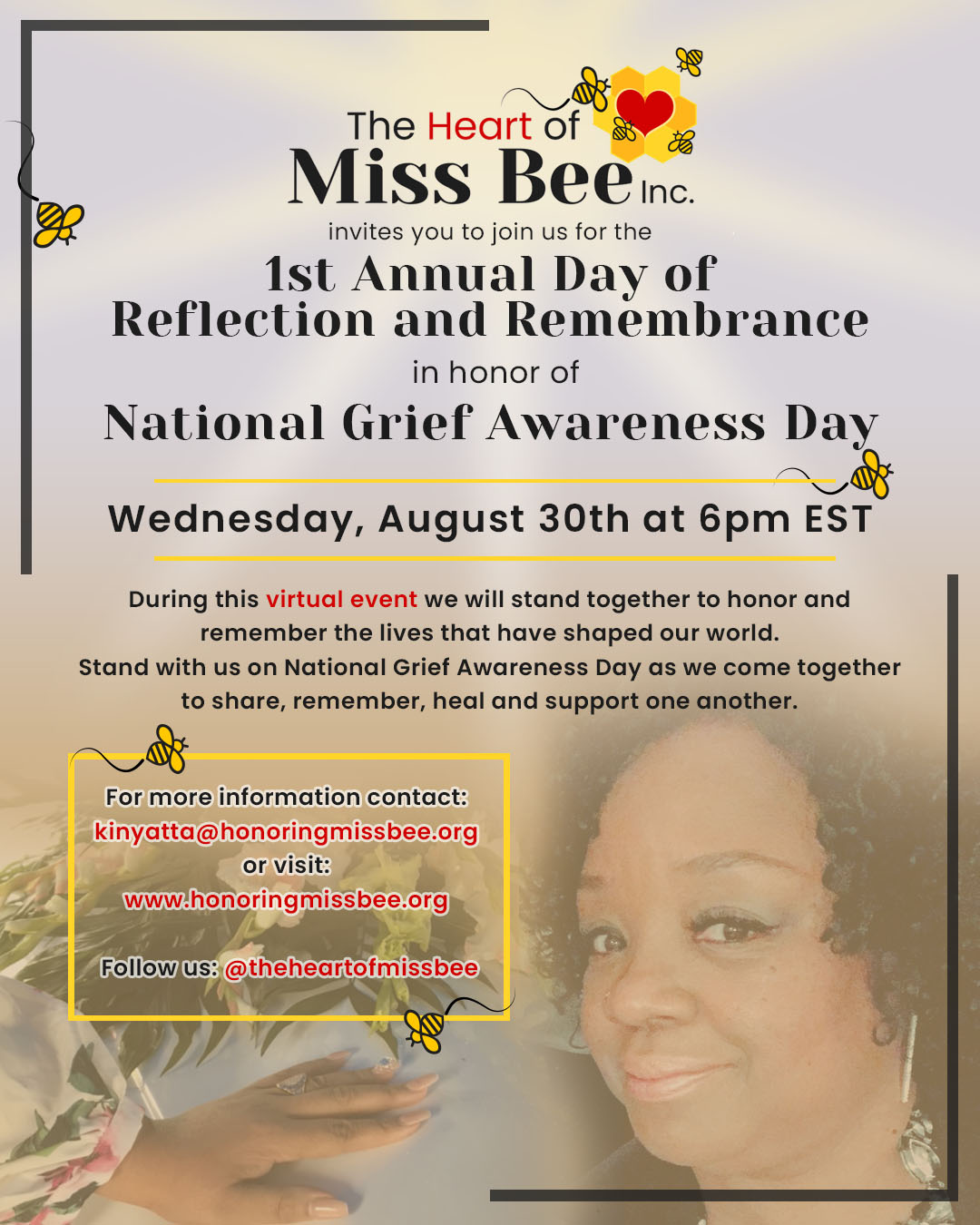 WASHINGTON, DC , UNITED STATES, August 23, 2023/EINPresswire.com/ -- Join The Heart of Miss Bee, Inc. as we pay tribute to National Grief Awareness Day on August 30th at 6 pm EST.
