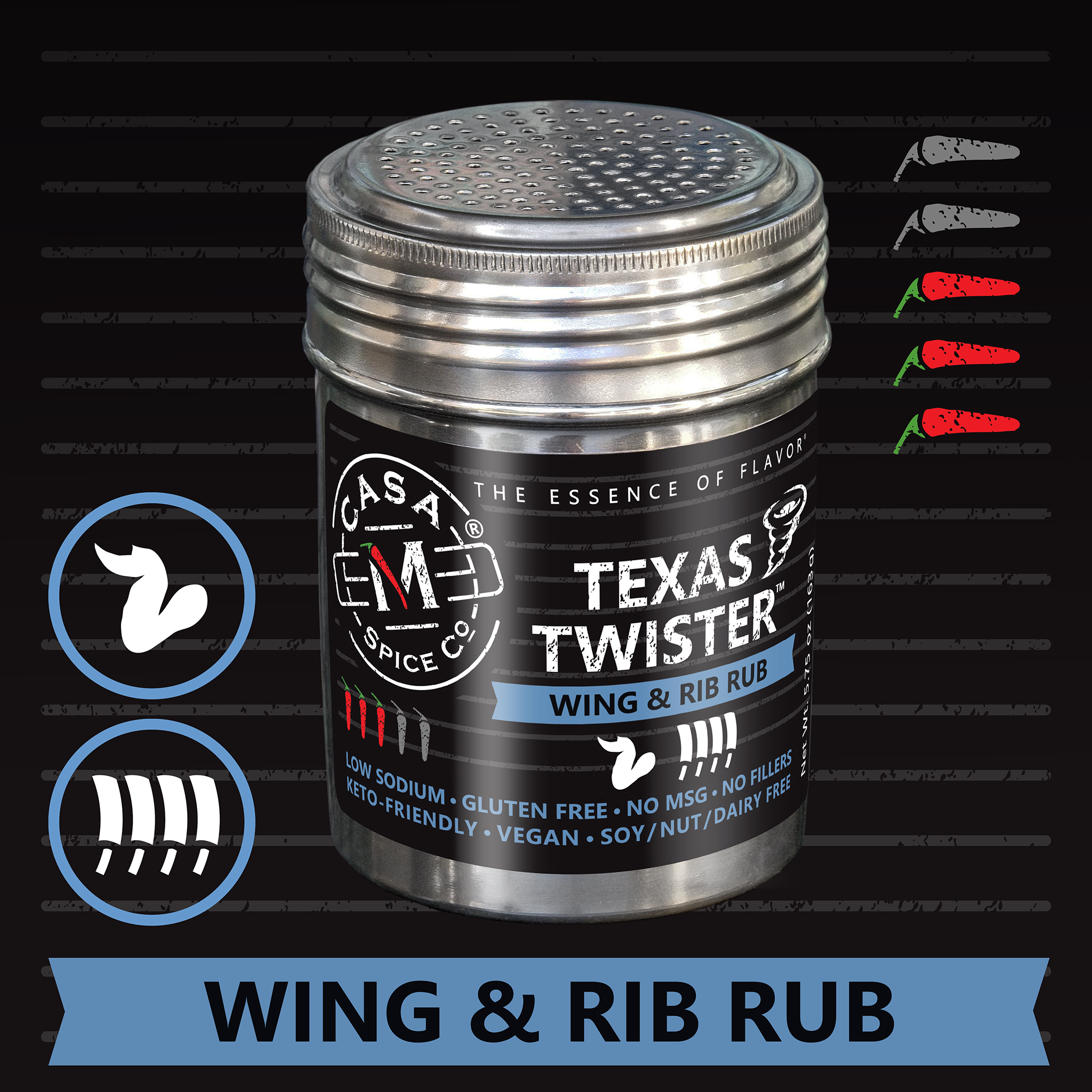 Texas Twister™ joins the Casa M collection of cleverly-named spice blends that includes Chain Reaction, a season-all, Cattle Drive for beef, Free Range for chicken, Good Shepherd for lamb, Hooked for fish and seafood, Jerked Chain a jerk seasoning, Pecking Order for poultry, and Whole Hog for pork. All of Casa M’s premium spice blends are low or very low sodium, keto-friendly, free of dairy, nut, and soy, and contain no fillers, MSG, Gluten, or animal products. This means you can Spice Confidently!®
