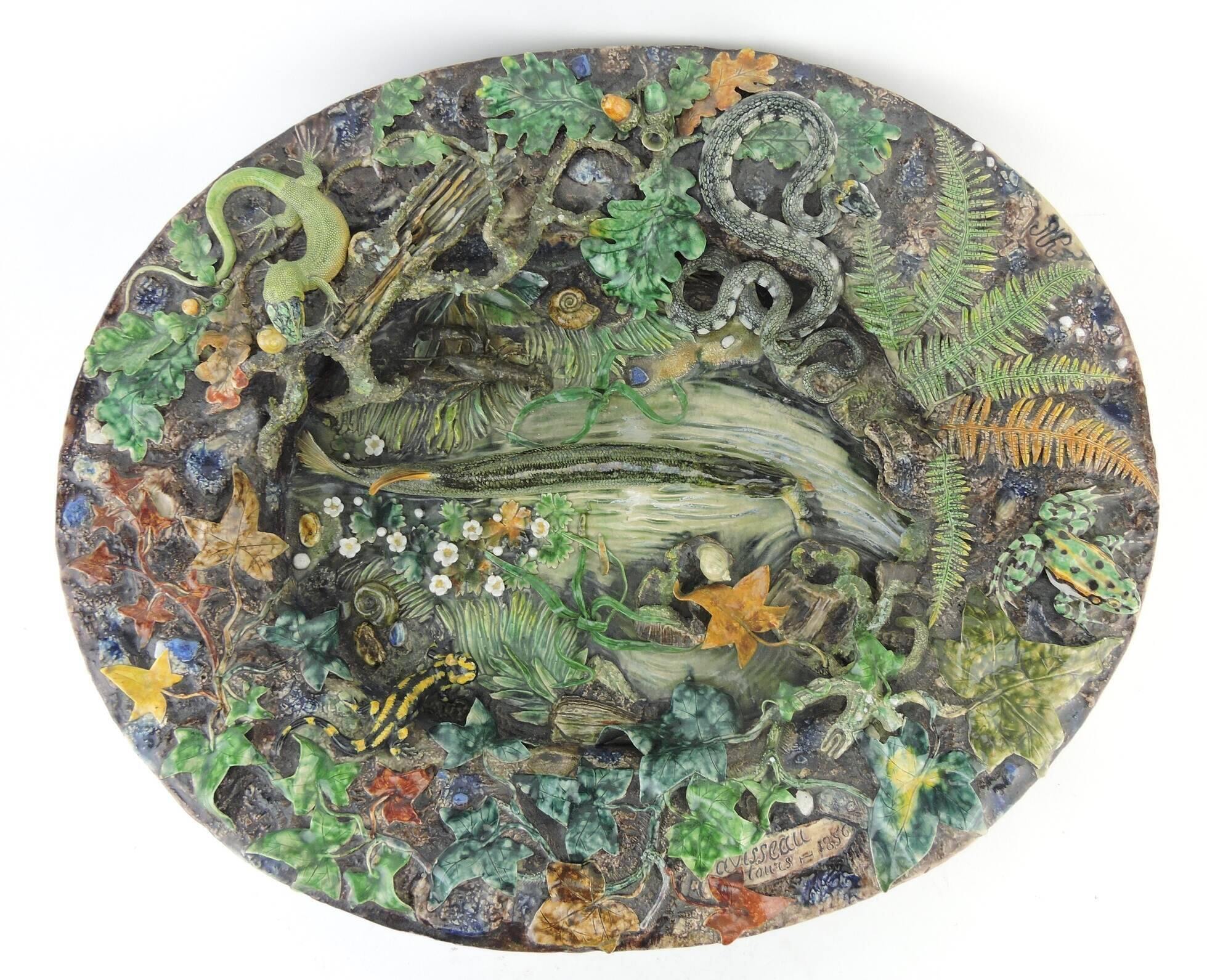 The other piece by Avisseau was also an “Art of the Earth” example, this one a Palissy grotto, circa 1856, polychrome, modeled as a naturalistic forest floor scene depicting a snake, lizard and frog climbing on rocks around a watery hole with lilies, ferns and grasses, a gnarled branch and oak leaves to the rear and a tablet to the front inscribed "Avisseau a tours 1856". The grotto represented the finest quality of 19th century Palissyware. It gaveled for $22,140.