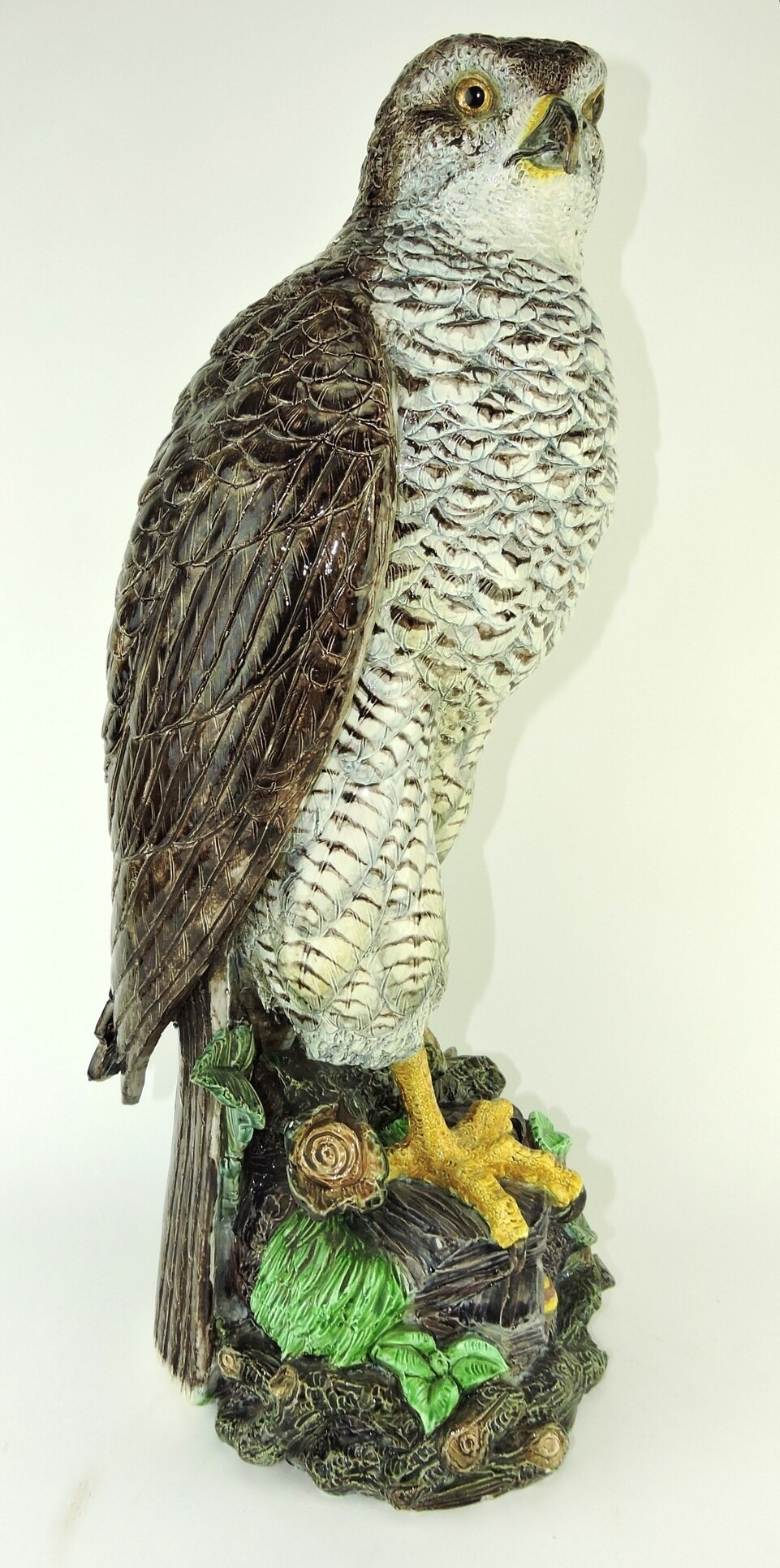 Hugo Lonitz majolica model of a hawk, created around 1875, with glass eyes, perched on a rocky ground with ferns and branches on an entwined branch base, 24 inches tall ($49,200).