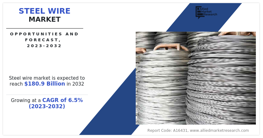 OREGON, PORTLAND, USA, August 30, 2023/EINPresswire.com/ -- Allied Market Research published a report, titled, “Steel Wire Market by Form (Rope, Non-Rope), By Material Type (Carbon Steel, Stainless Steel, Alloy Steel, Others), By End-Use (Construction, Automotive, Aviation, Energy, Agriculture, Others): Global Opportunity Analysis and Industry Forecast, 2023-2032 “. According to the report, the global steel wire industry generated $96.6 Billion in 2022, and is anticipated to generate $180.9 Billion by 2032, witnessing a CAGR of 6.5% from 2023 to 2032.