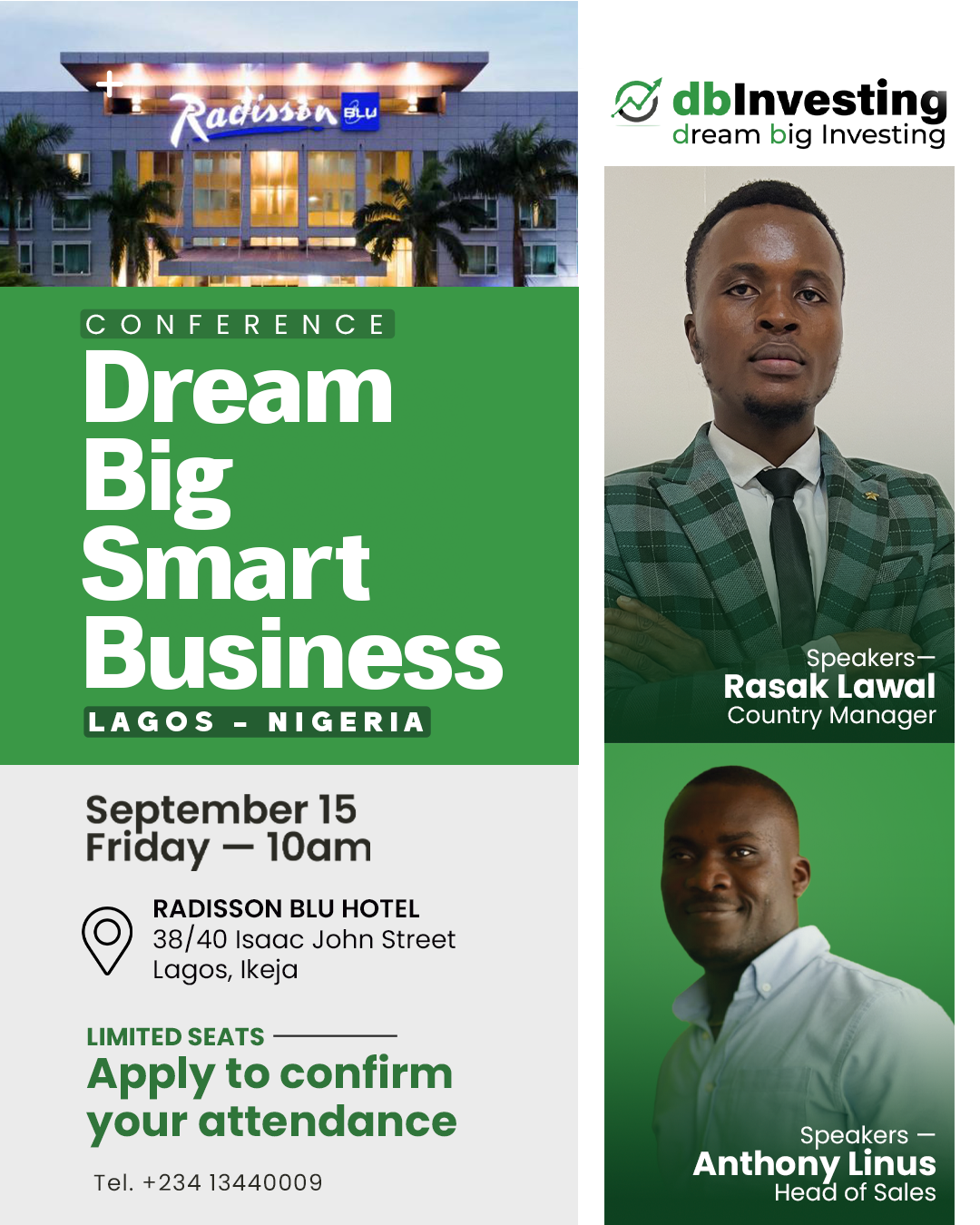 LAGOS, NIGERIA, August 31, 2023/EINPresswire.com/ -- DB Investing is thrilled to announce its first-ever "Dream Big Smart Business Conference," a game-changing event poised to reshape the entrepreneurial landscape by offering invaluable insights and strategies for success in the dynamic world of business.Scheduled to take place on September 15 at the prestigious Radisson Blu Hotel in Lagos, Ikeja, this conference is poised to be a pivotal gathering of business enthusiasts, investors, aspiring entrepreneurs, and seasoned professionals, all united by their passion for turning dreams into thriving ventures.