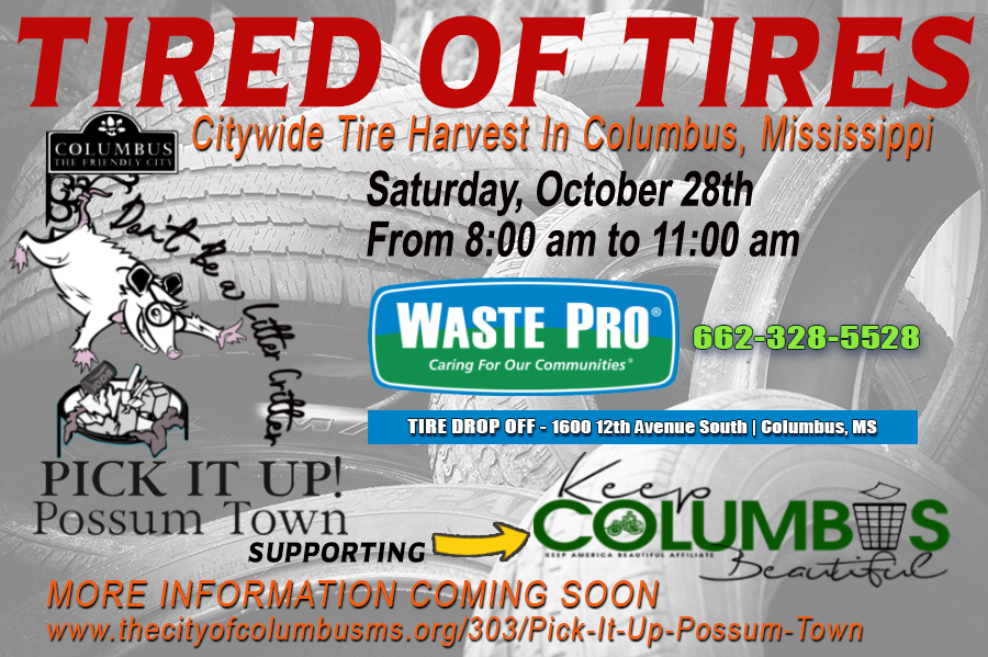 Pick It Up! Possum Town and Keep Columbus Beautiful work together to keep Columbus, Mississippi, clean and beautiful and seek community-minded volunteers for this and future litter clean-up and beautification projects. Citizens unable to participate in the Tired of Tires event are encouraged to use this day to clean their yards, properties, homes, and businesses. Citizens are further encouraged to communicate the need for a clean and beautiful Columbus by sharing their knowledge of this and future clean-up projects, liking and sharing social posts on Facebook, Twitter, Nextdoor, and Instagram, and directly communicating its value and purpose with friends, family, and coworkers.
